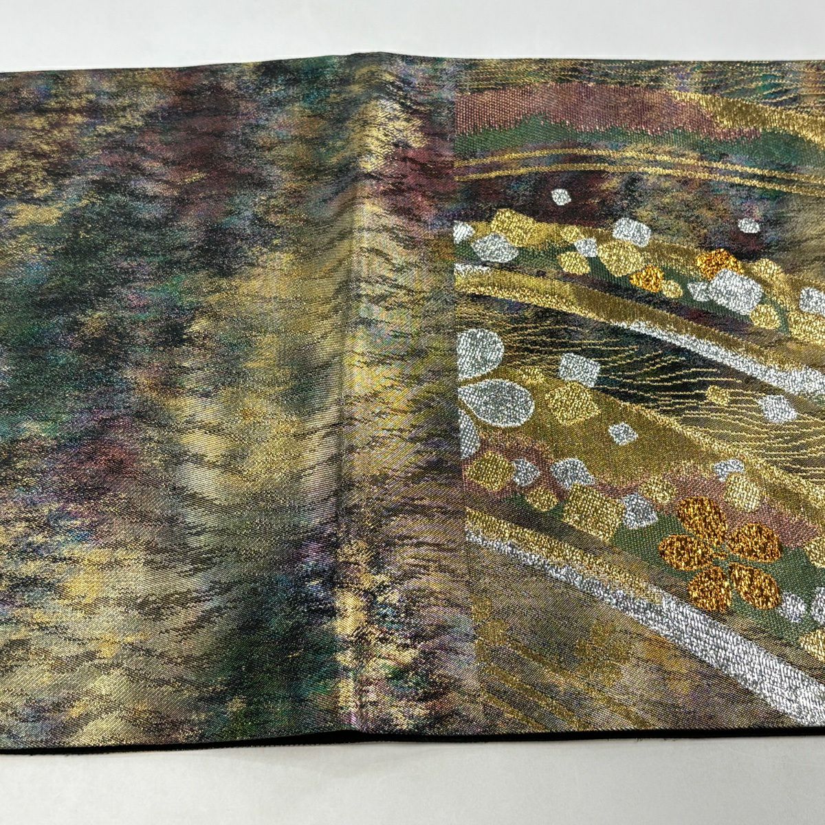 【美品】 袋帯 秀品 やまと 幾何学模様 斜めぼかし 金銀糸 銀通し 青灰色 六通 正絹