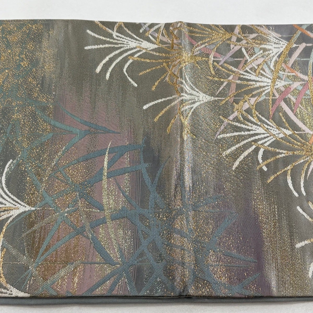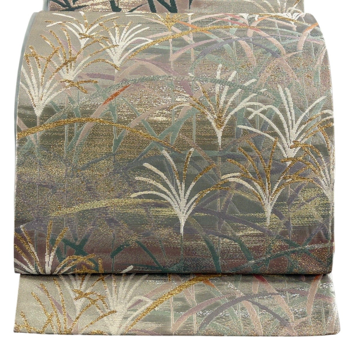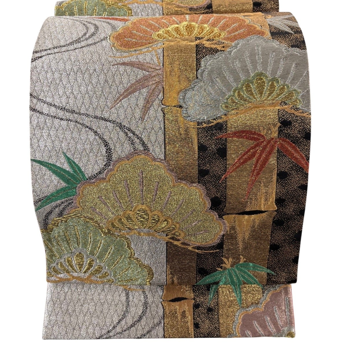 【美品】 袋帯 秀品 振袖向き 笠松 竹 金銀糸 箔 銀色 六通 正絹