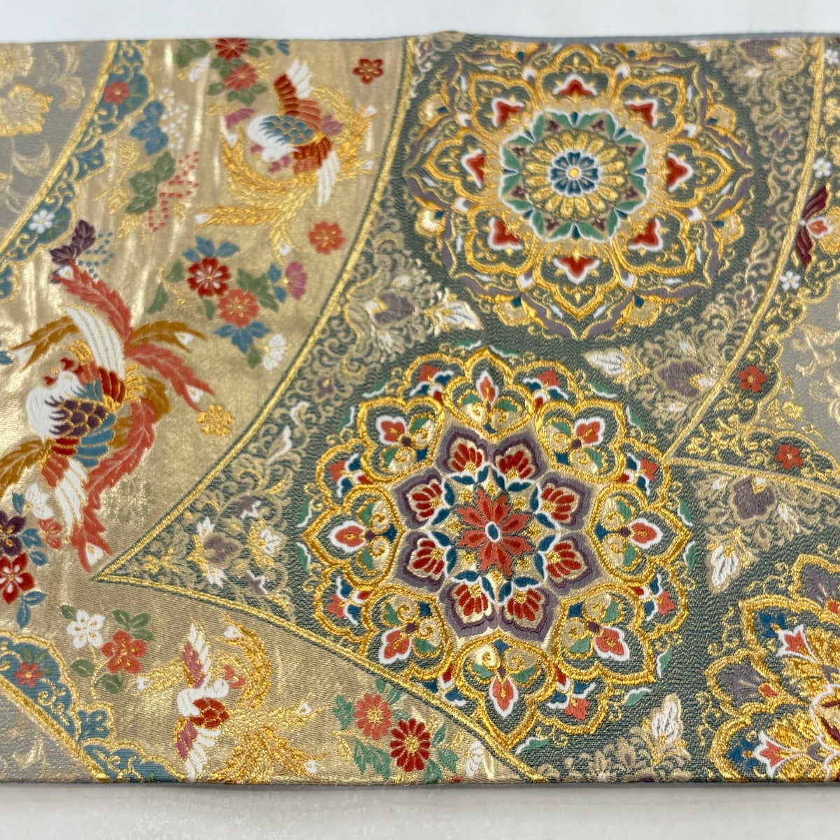 70%OFF 【美品】 袋帯 秀品 花鳥 有職文様 金糸 箔 薄緑 六通 正絹 K70