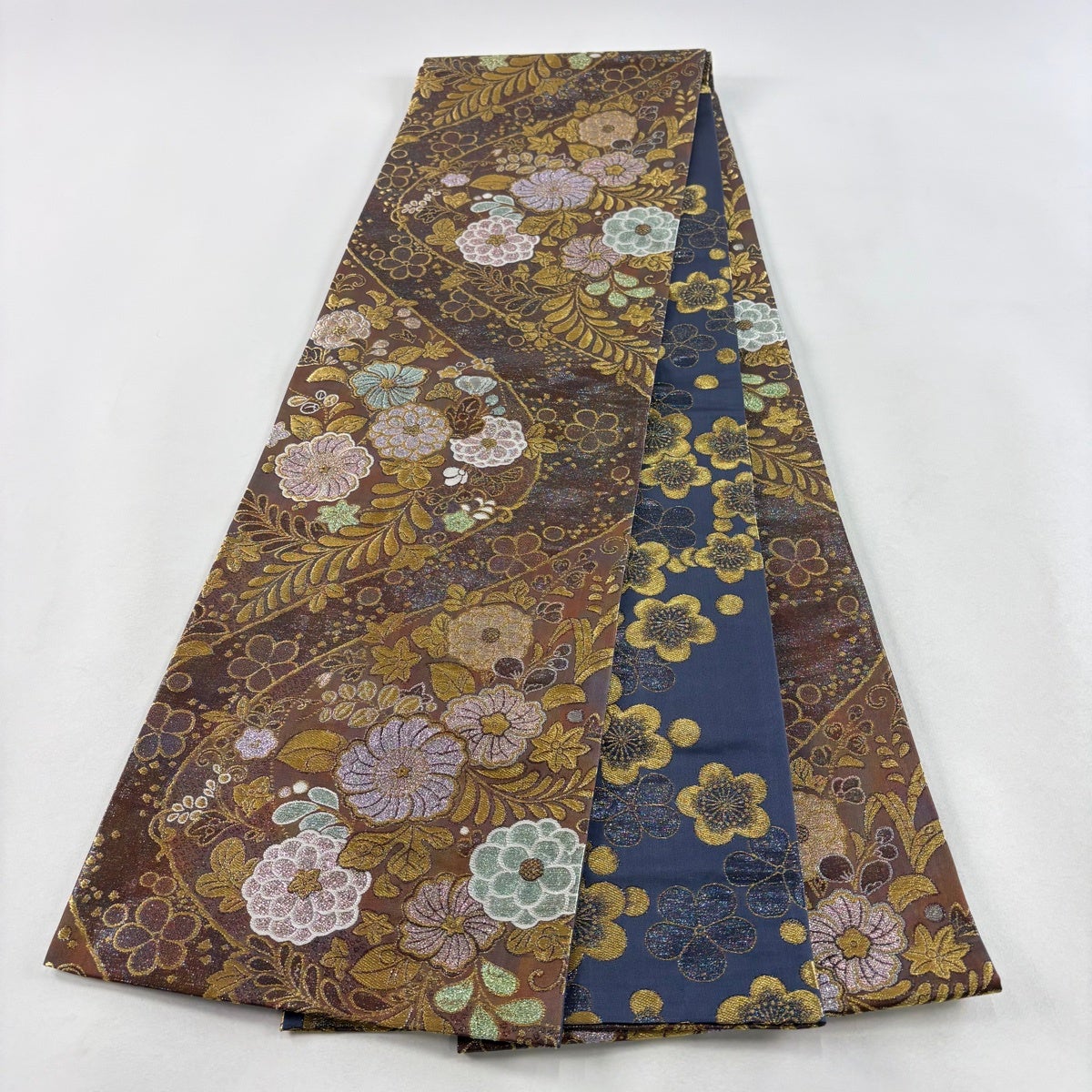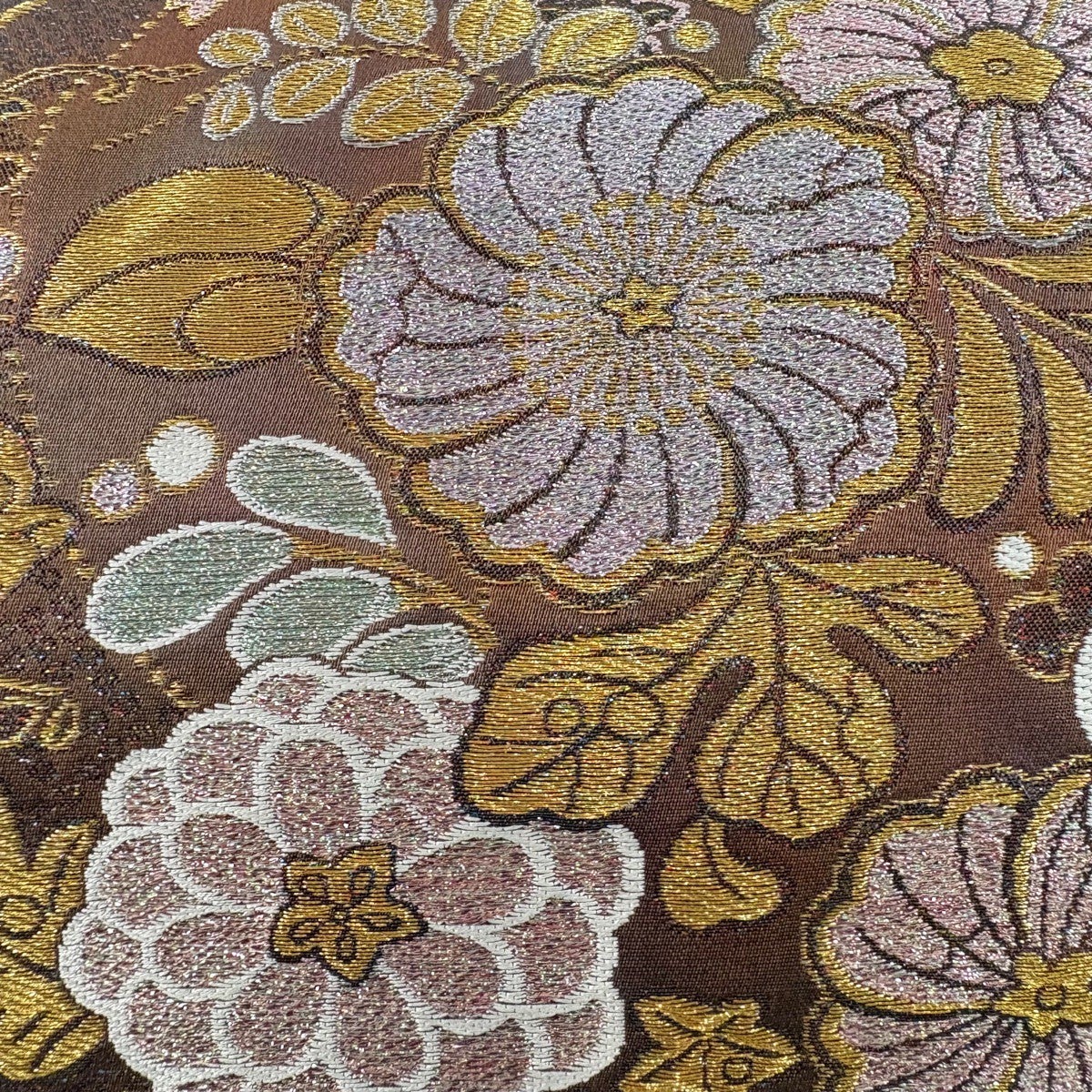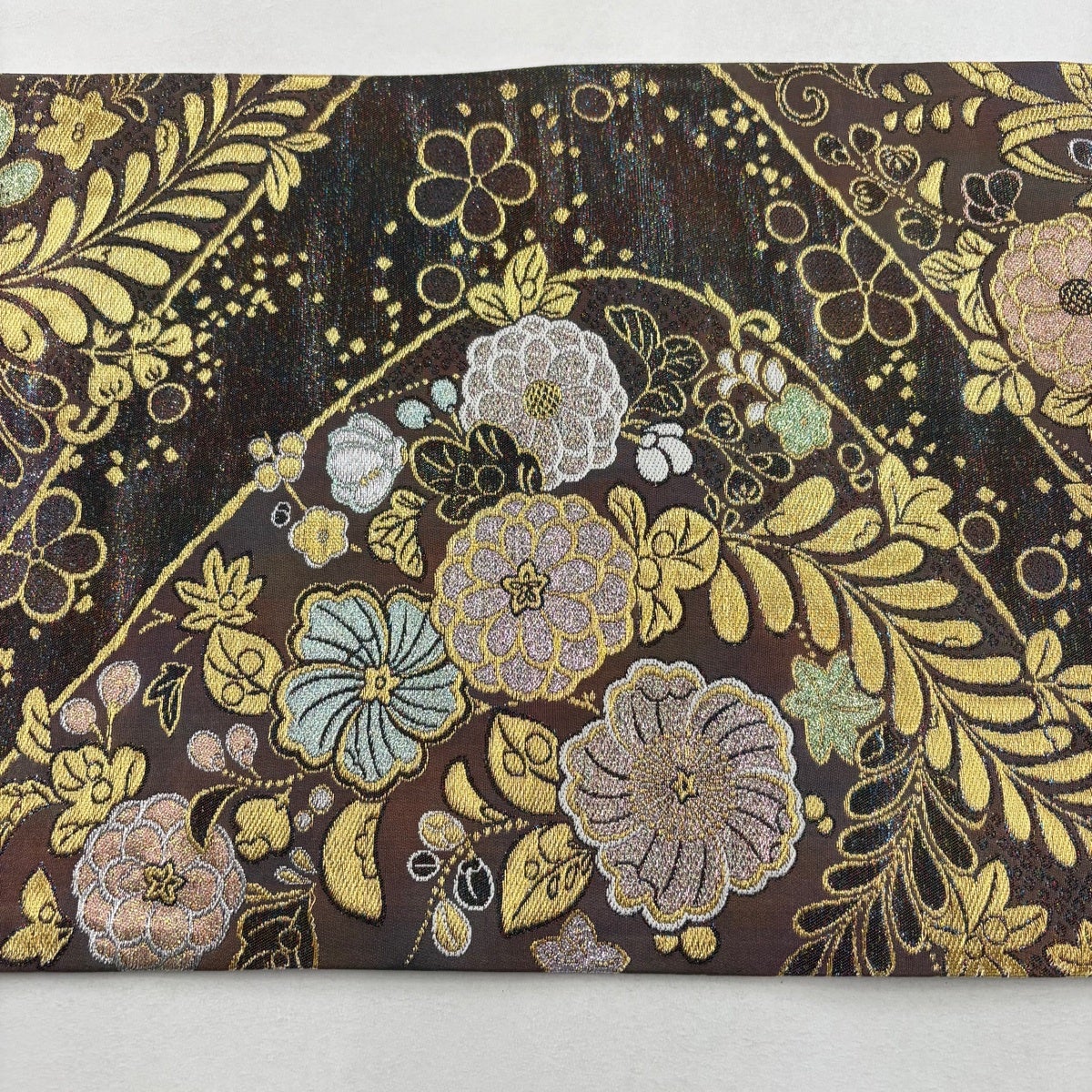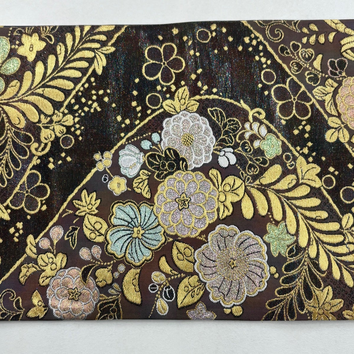 【美品】 袋帯 秀品 夢はな舞 桜 市松 金銀糸 箔 茶色 六通 正絹