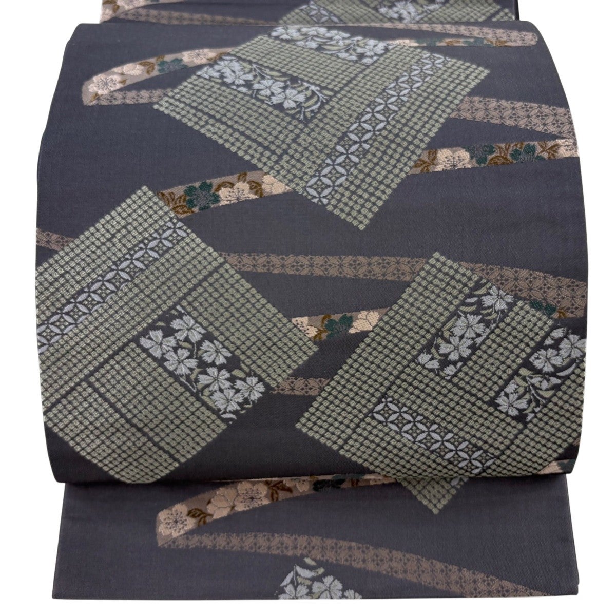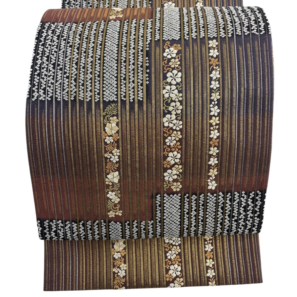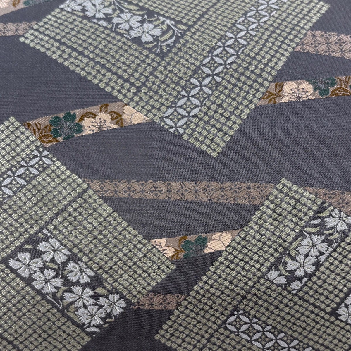 30%OFF 【美品】 袋帯 秀品 花 縞 金糸 茶緑色 全通 正絹 K30