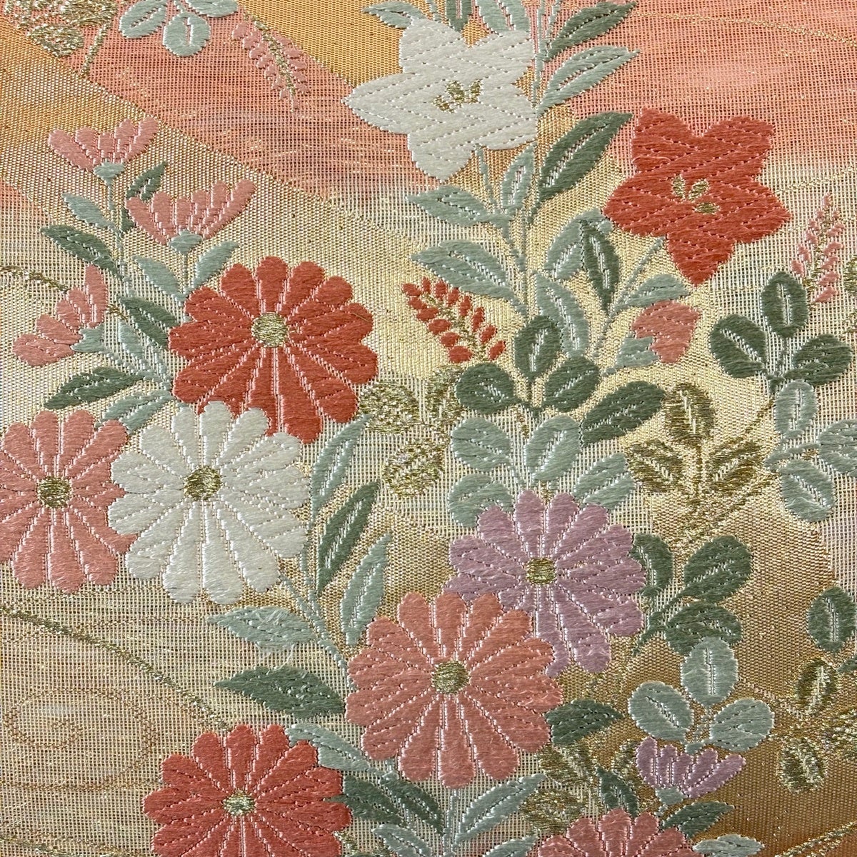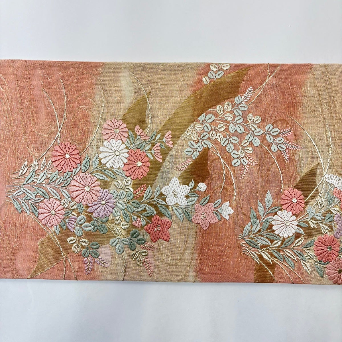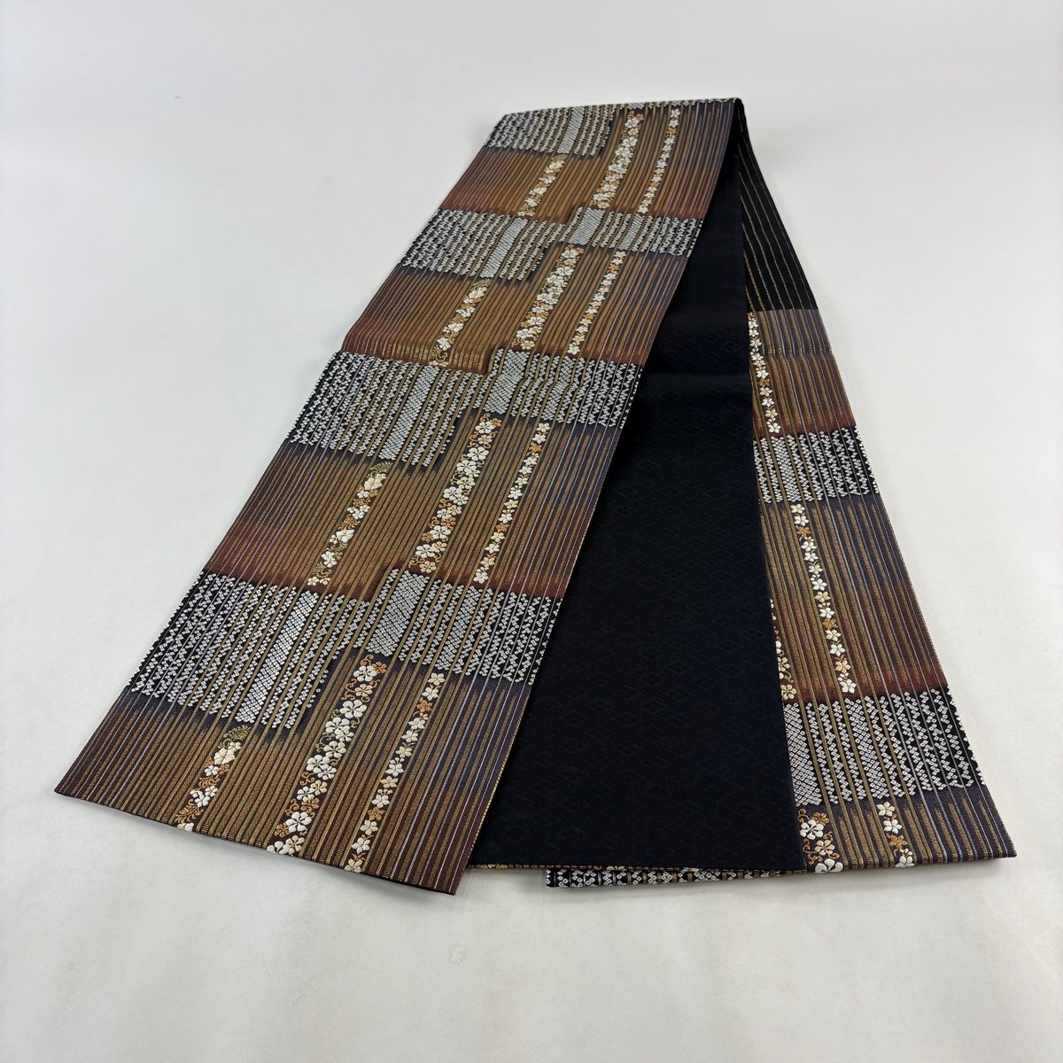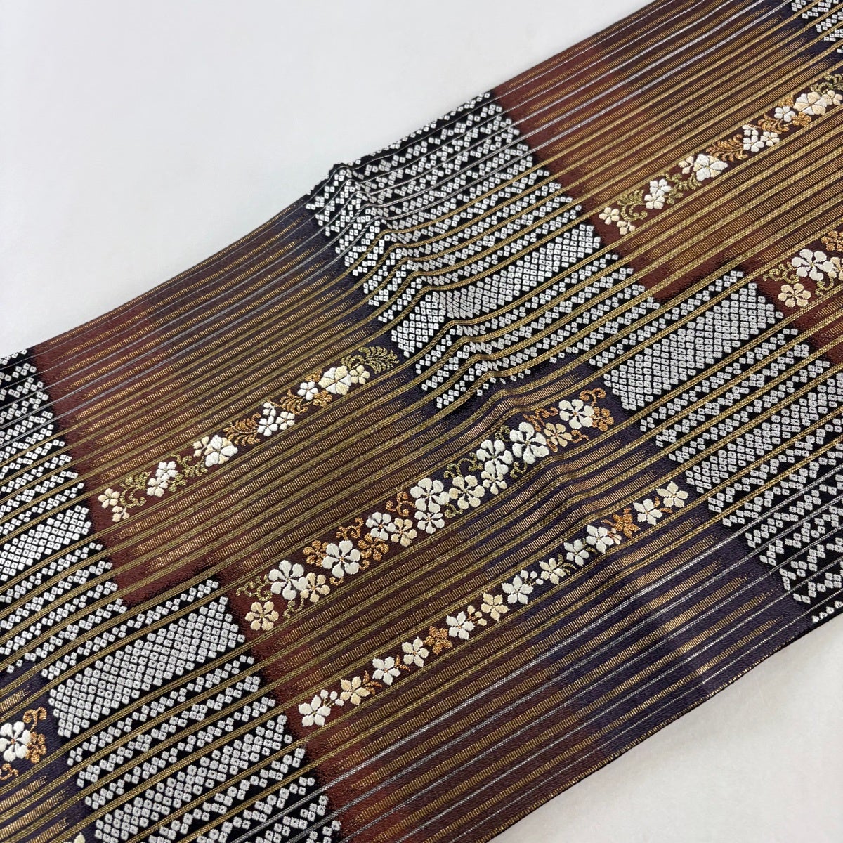 30%OFF 【美品】 袋帯 秀品 花 縞 金糸 茶緑色 全通 正絹 K30