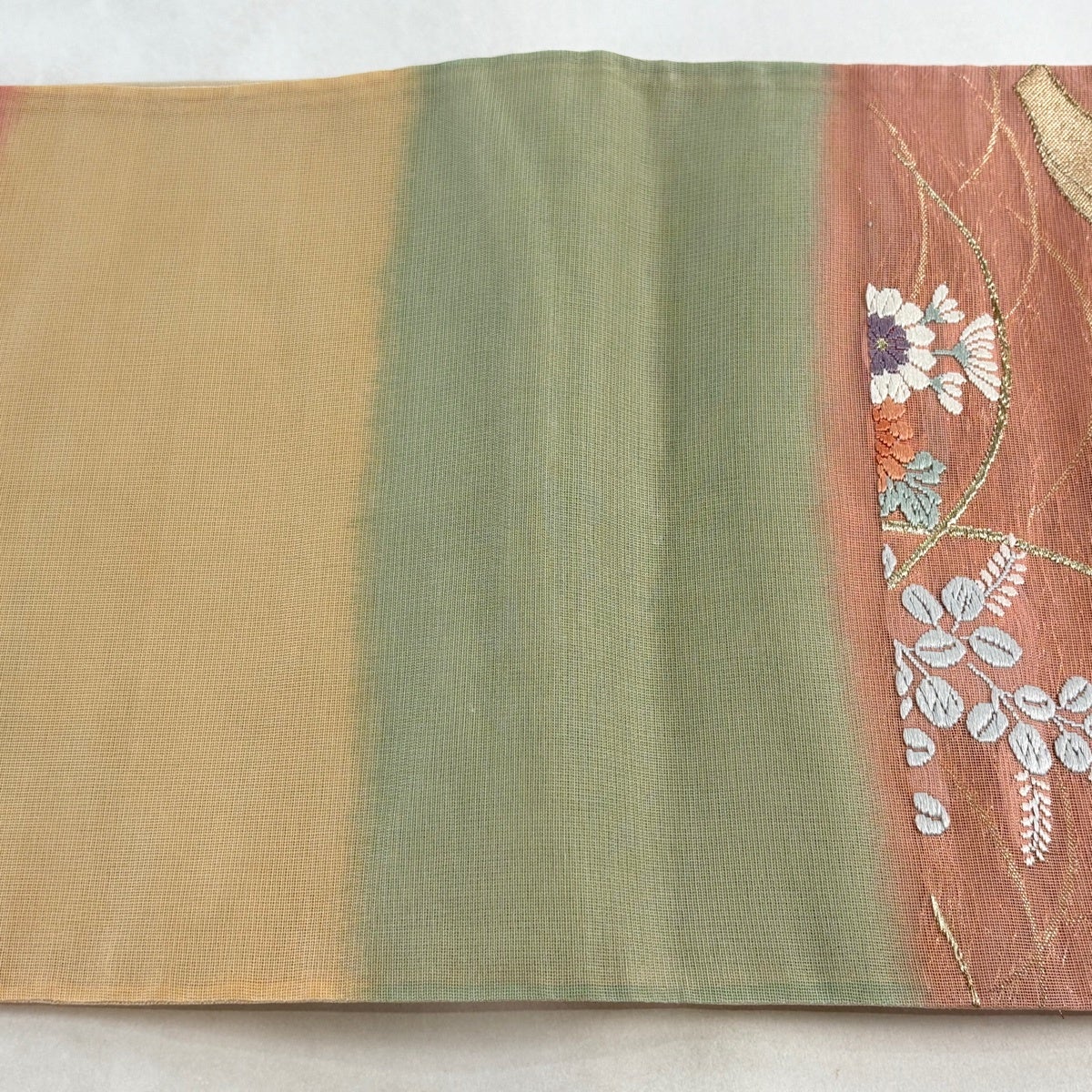 【美品】 袋帯 秀品 夏帯 紗 花束 刺繍 金糸 薄茶色 六通 正絹