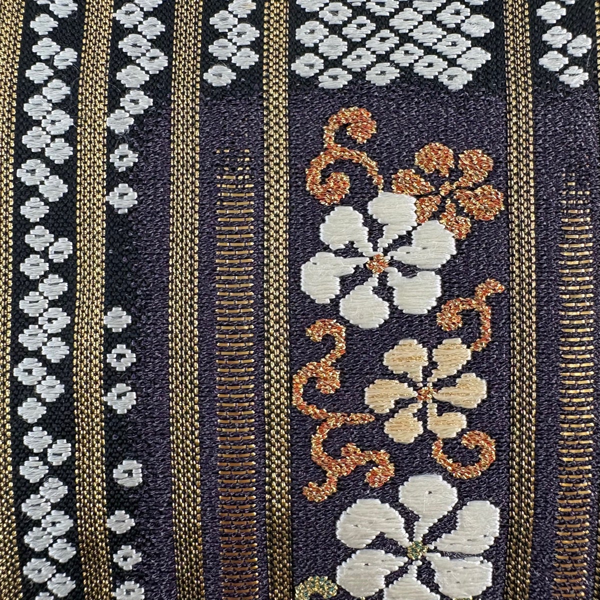 【美品】 袋帯 秀品 縞 花唐草 金糸 箔 紫 六通 正絹