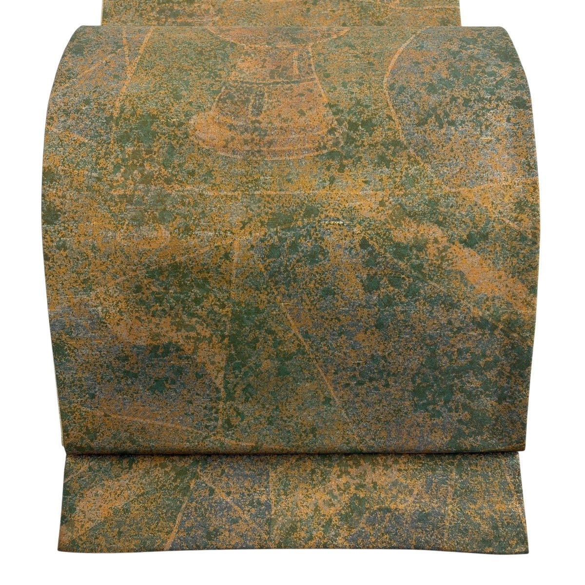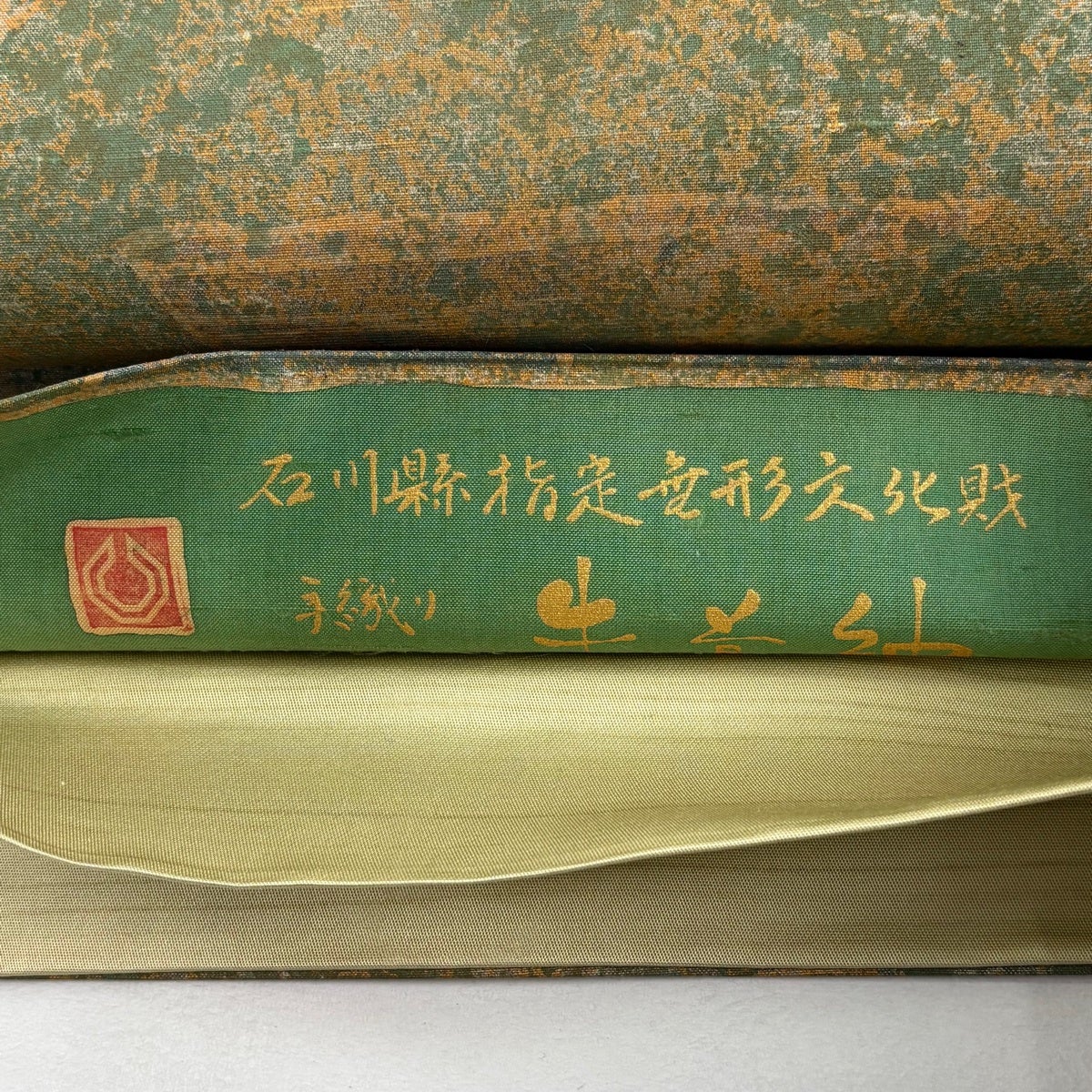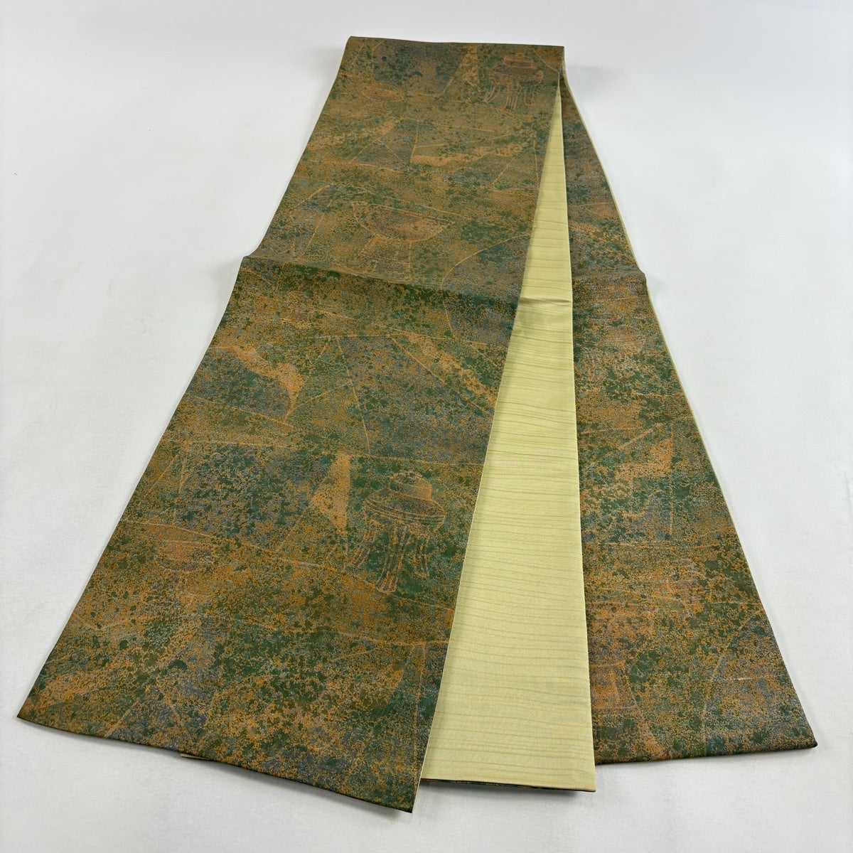 【美品】 袋帯 秀品 蜀江華文 花唐草 切嵌 箔 茶緑色 お太鼓柄 正絹