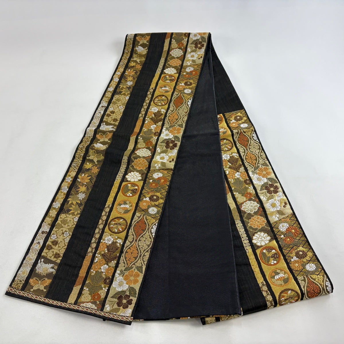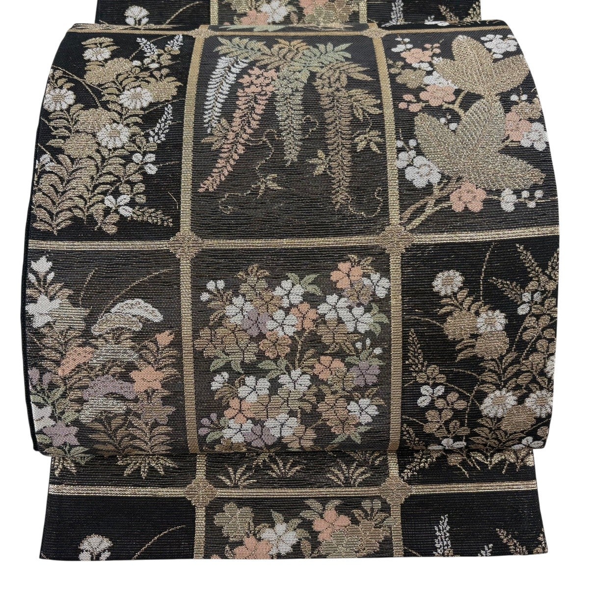 【美品】 袋帯 秀品 雪輪四季草花文 金糸 黒 六通 正絹