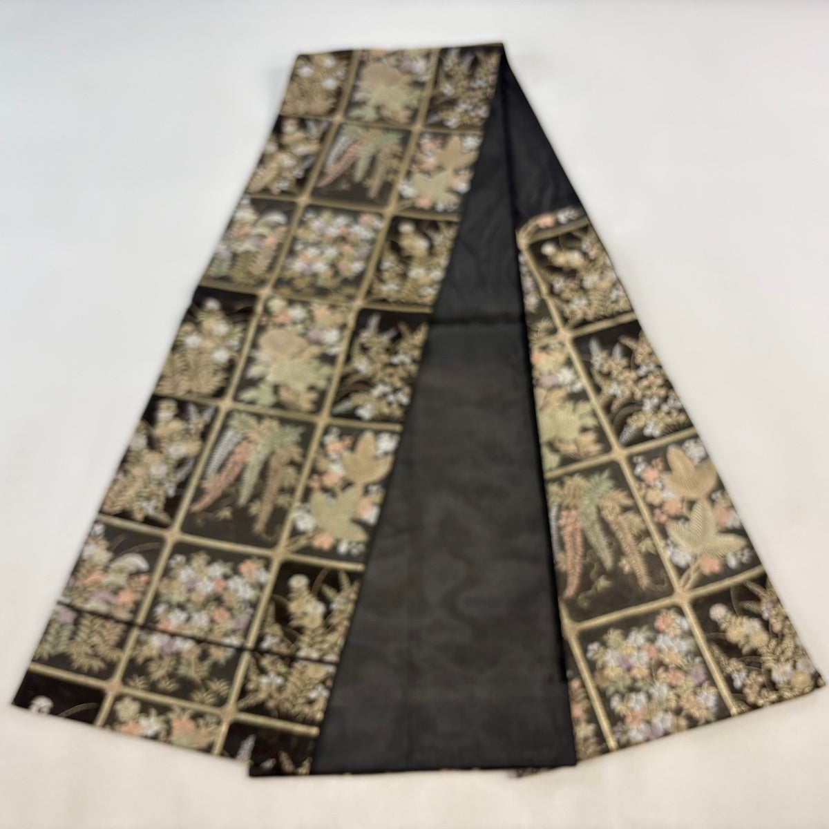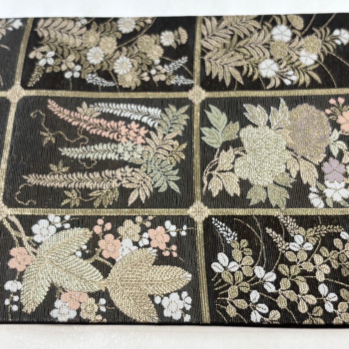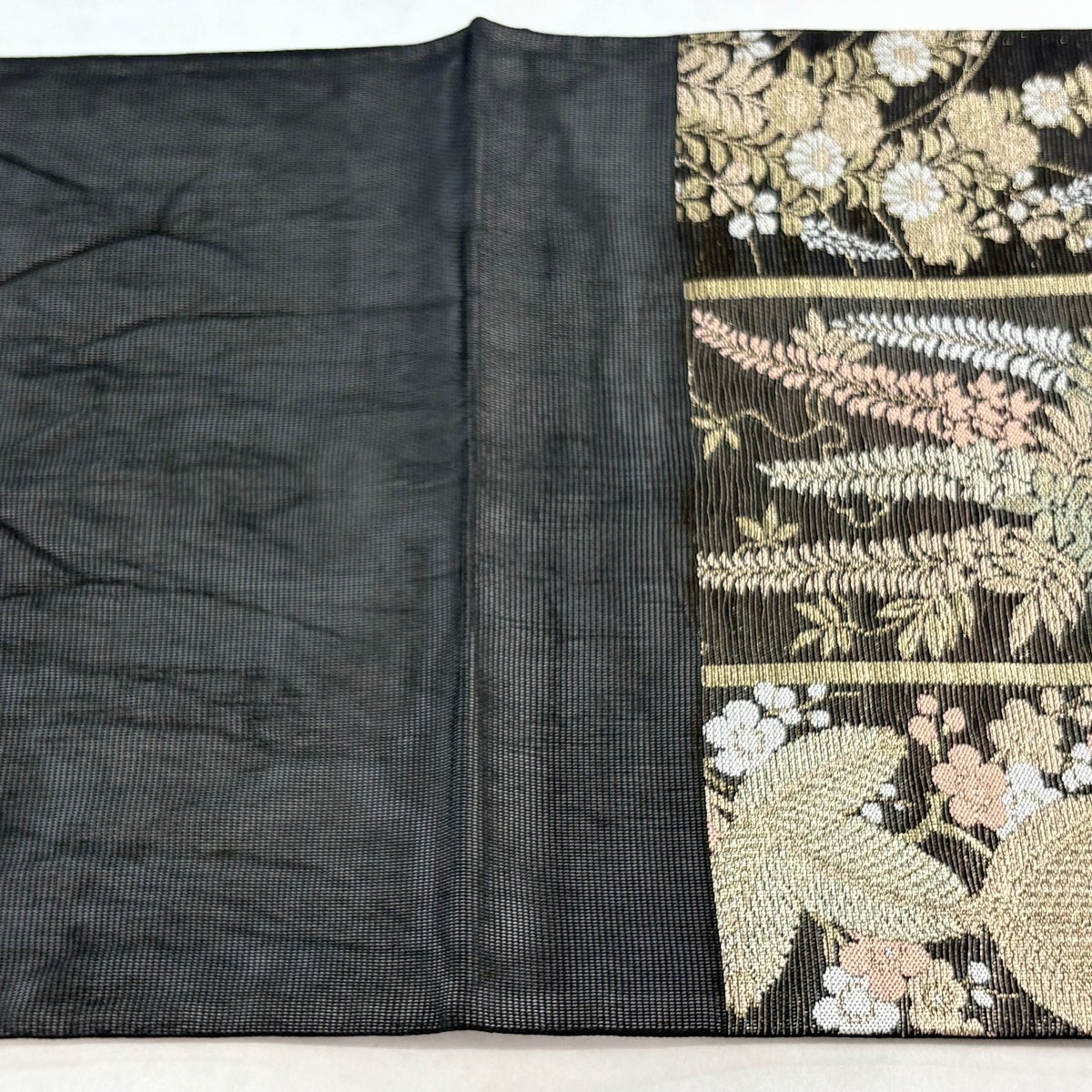 【美品】 袋帯 秀品 夏帯 格天井 秋草 金糸 箔 黒 六通 正絹
