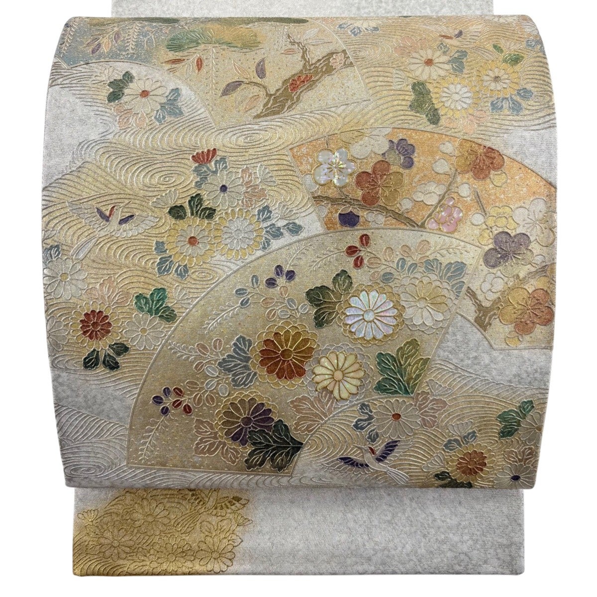 【在庫一掃】 【美品】 袋帯 秀品 関西仕立て 扇面 向かい鳥 金糸 箔 ベージュ 六通 正絹