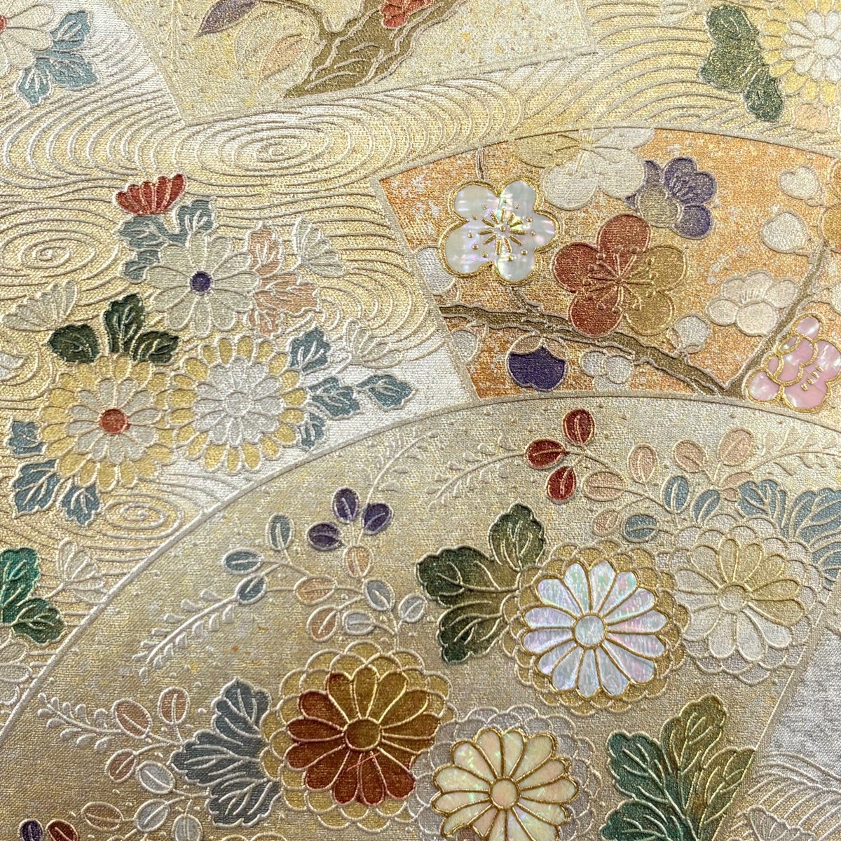 【美品】 袋帯 名品 扇面 花鳥 螺鈿 金銀彩 金色 お太鼓柄 正絹