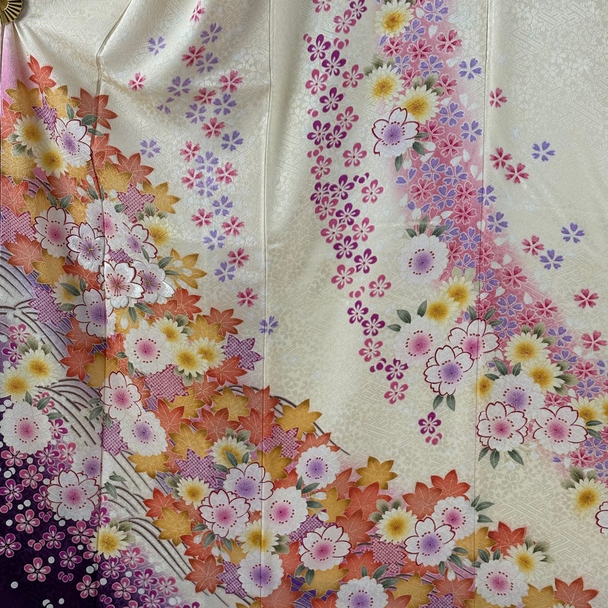 【美品】 振袖 身丈169cm 裄丈66cm M 袷 袋帯フルセット 桜 波 箔 刺繍 クリーム 正絹 名品