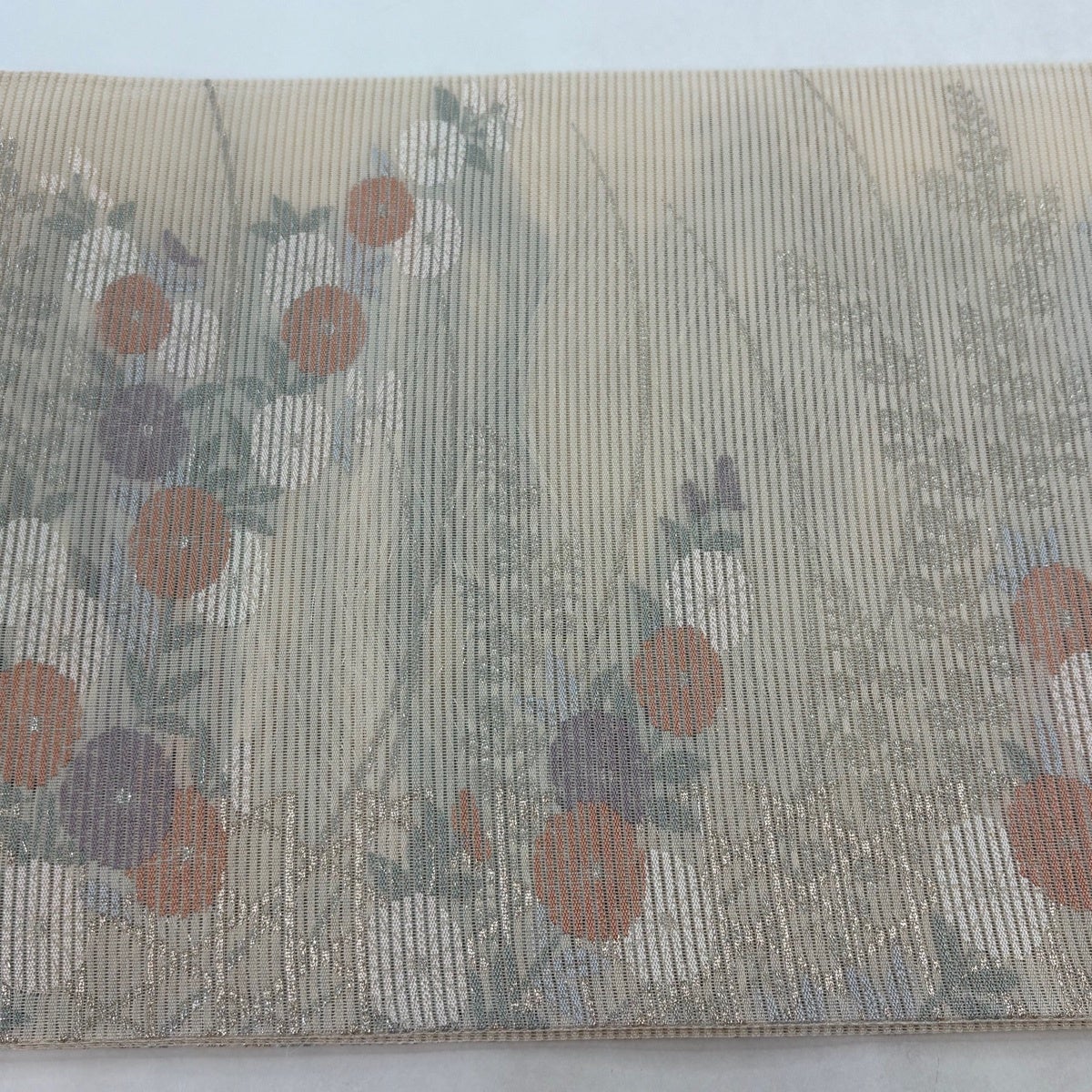 袋帯 秀品 夏帯 絽 草花 金銀糸 クリーム お太鼓柄 正絹