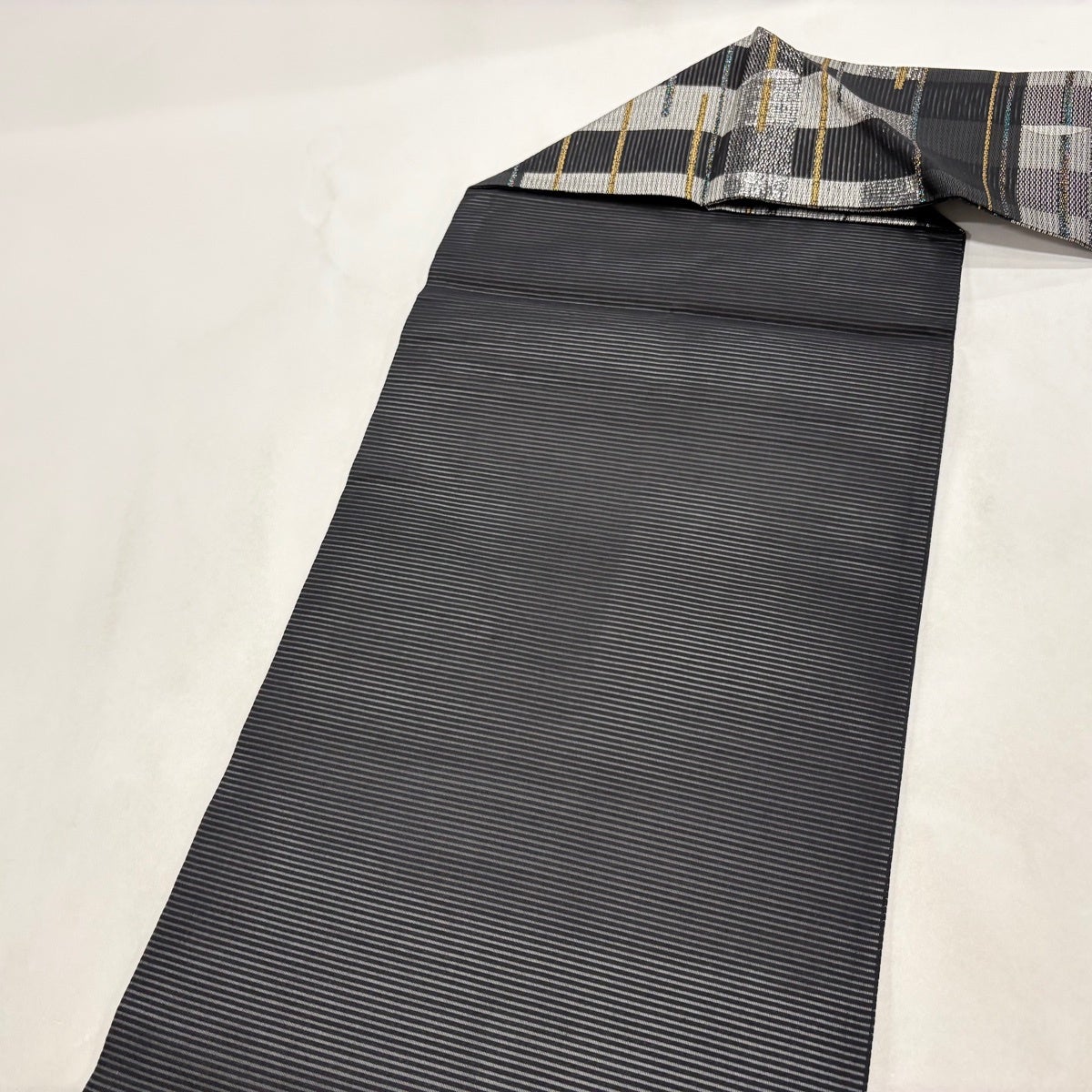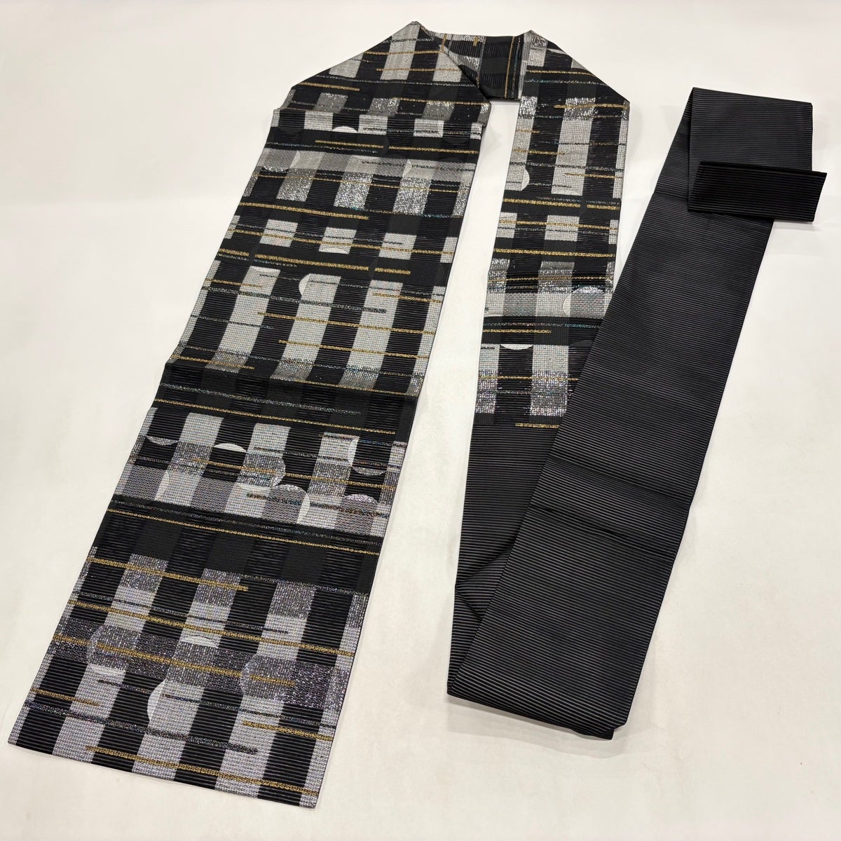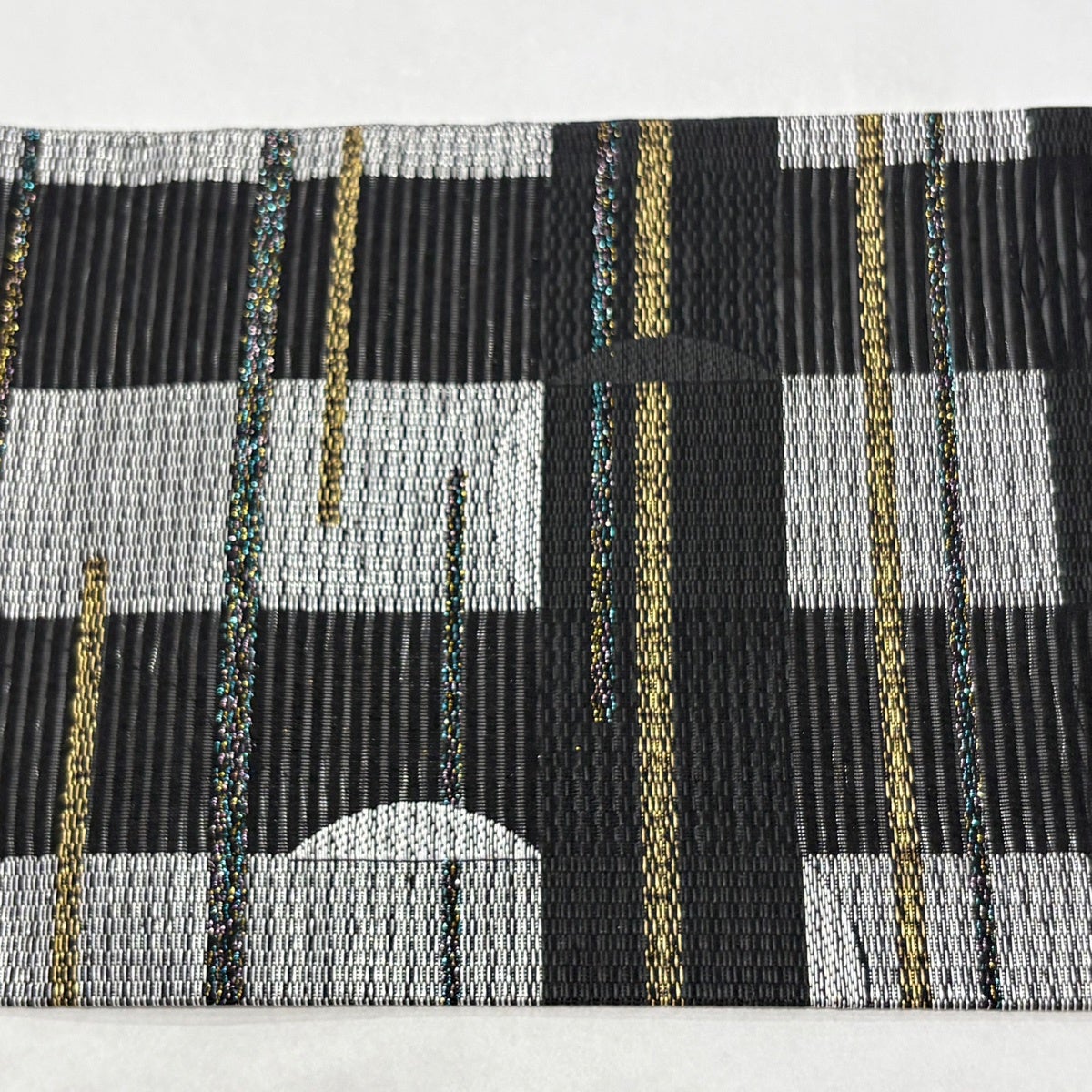 名古屋帯 秀品 夏帯 絽 八寸名古屋帯 幾何学模様 金糸 黒灰 正絹