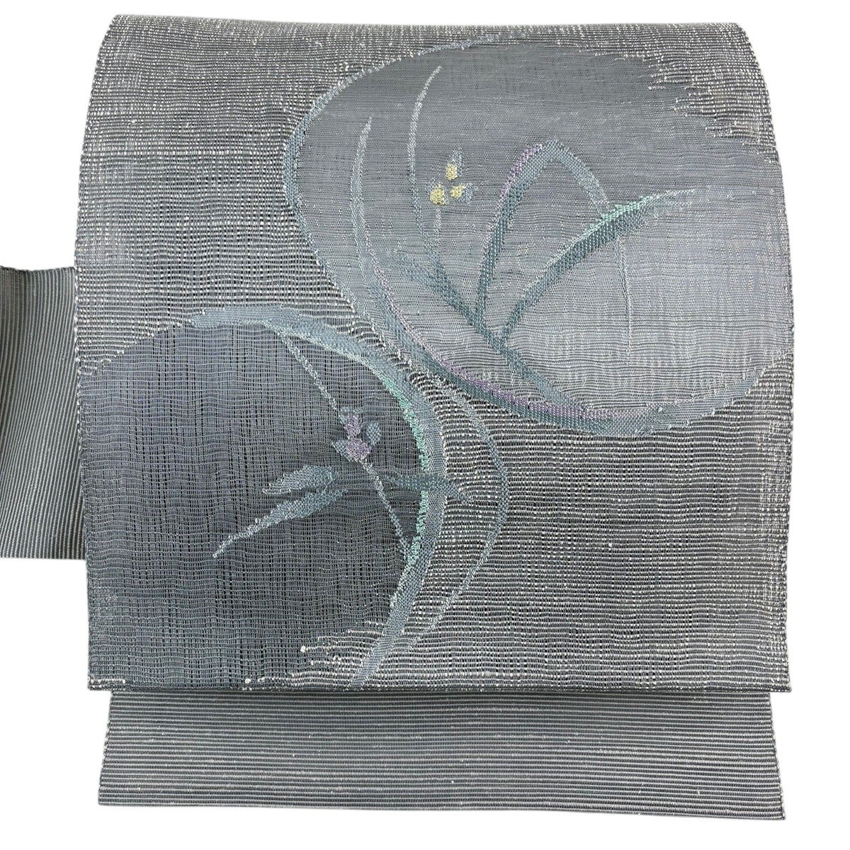 【美品】 名古屋帯 秀品 夏帯 絽 八寸名古屋帯 草花 灰色 正絹