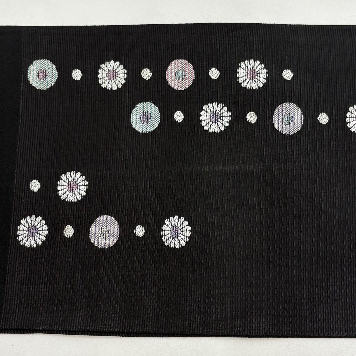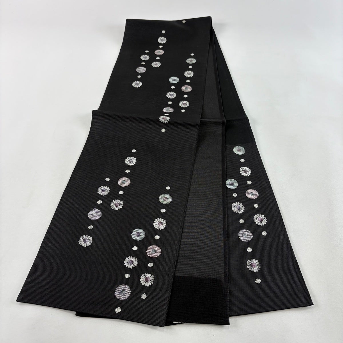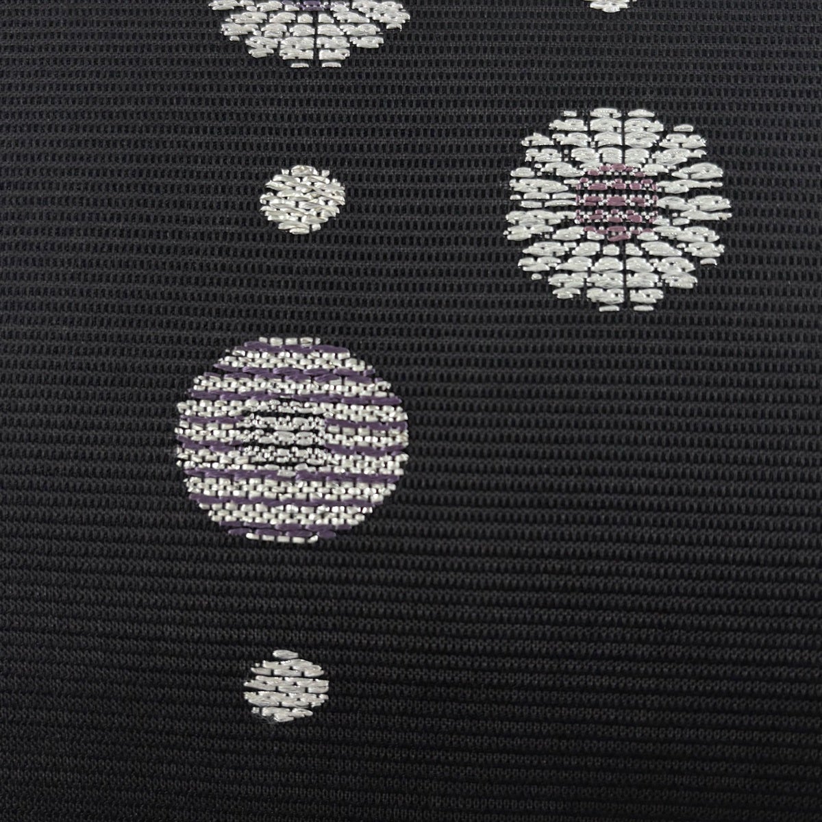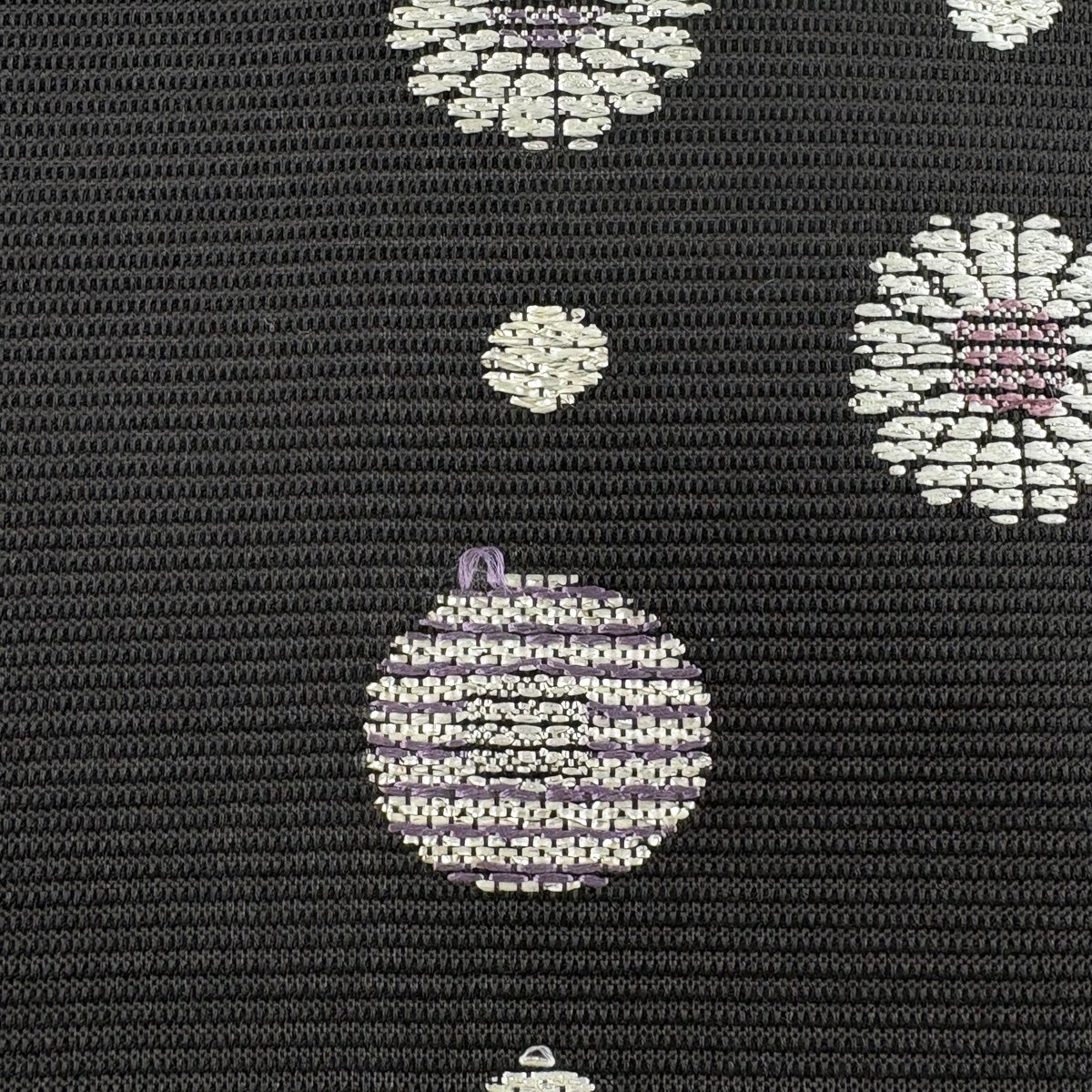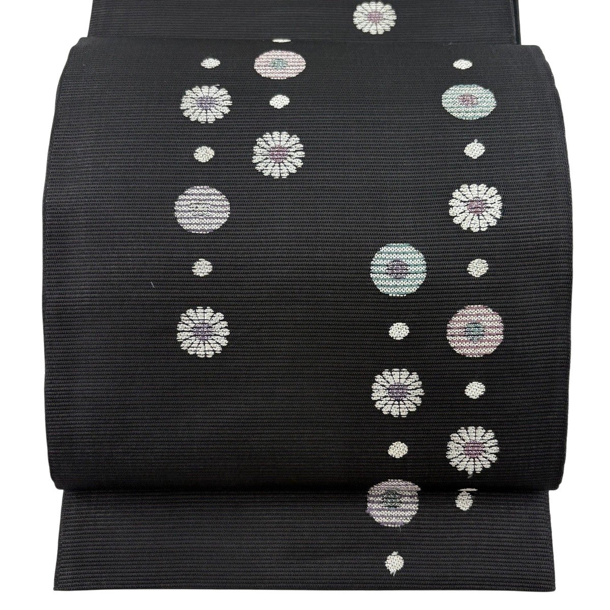 袋帯 秀品 夏帯 絽 菊 幾何学 銀糸 箔 墨色 六通 正絹