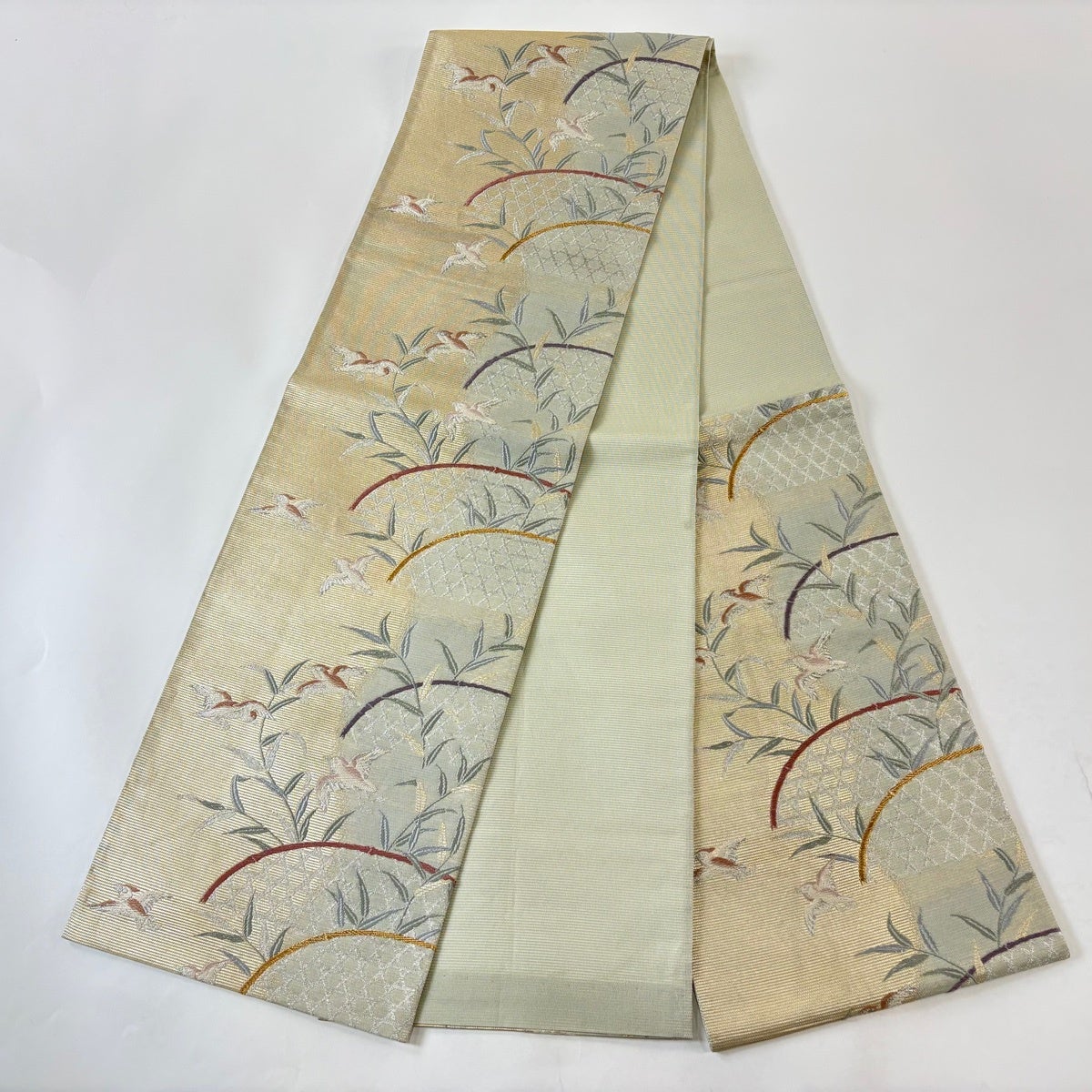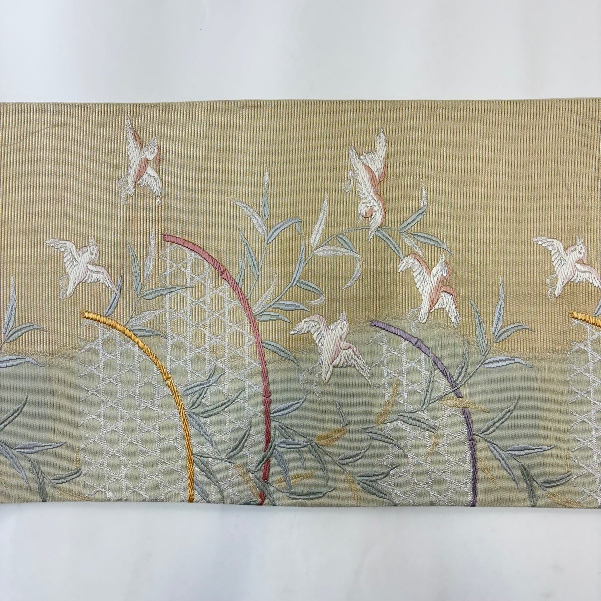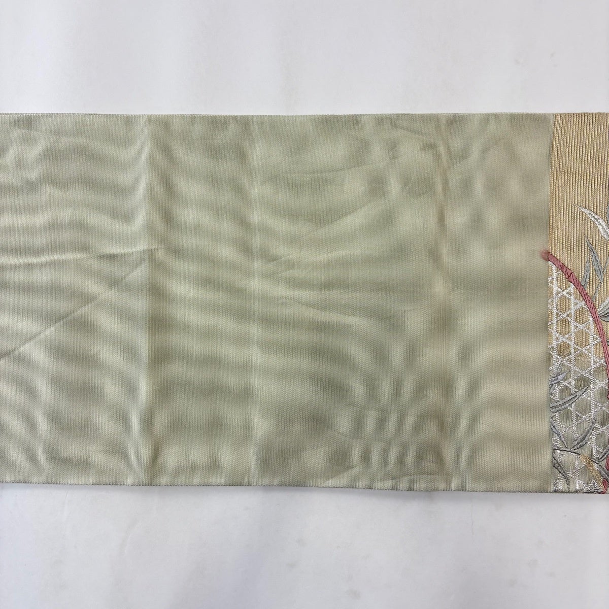 袋帯 秀品 夏帯 絽 冊子 花鳥 金糸 薄緑 お太鼓柄 正絹