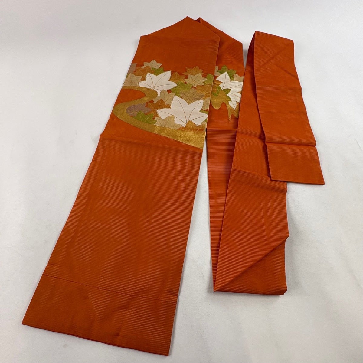 名古屋帯 優品 夏帯 絽 楓 流水 金糸 箔 オレンジ 正絹