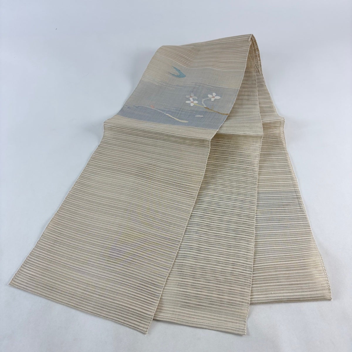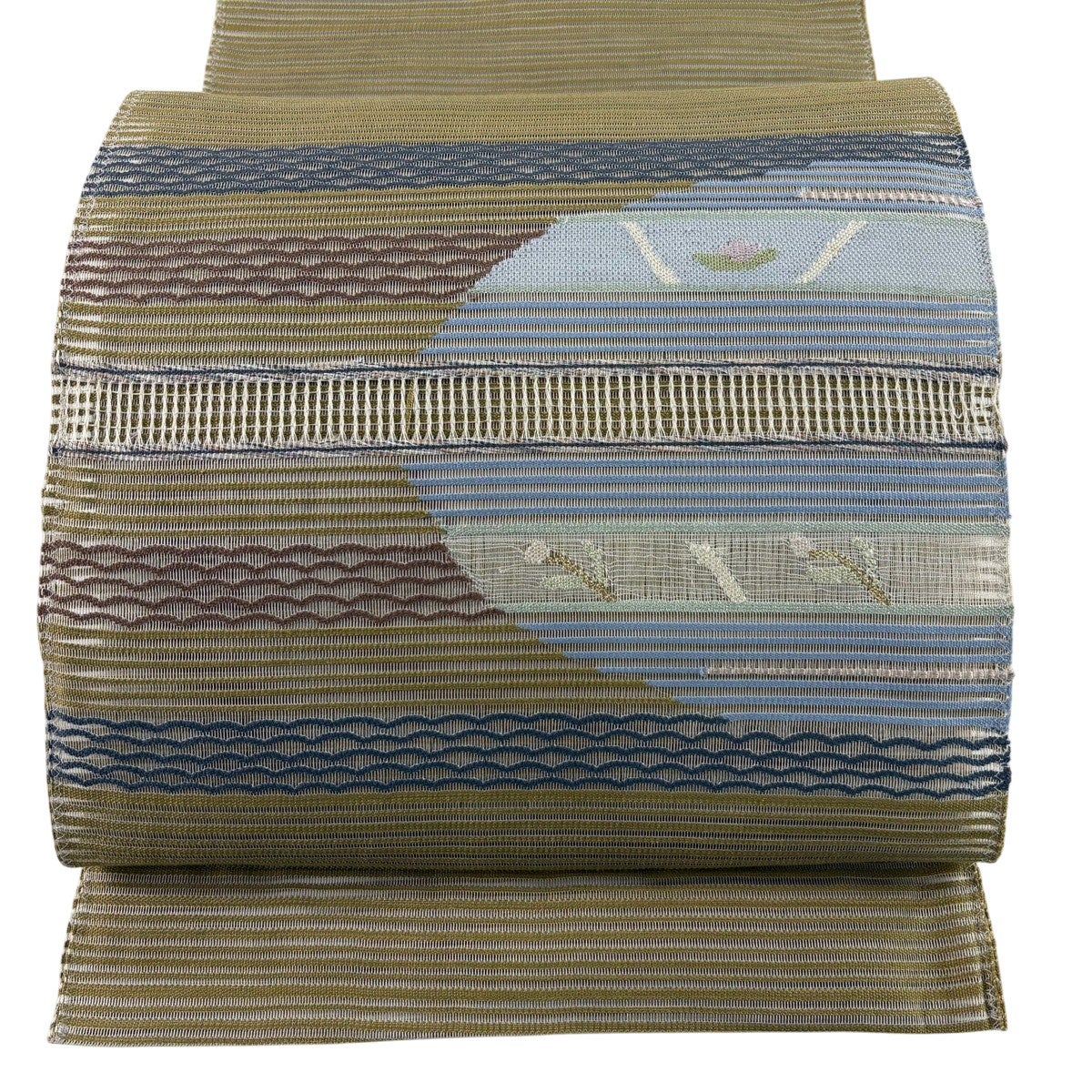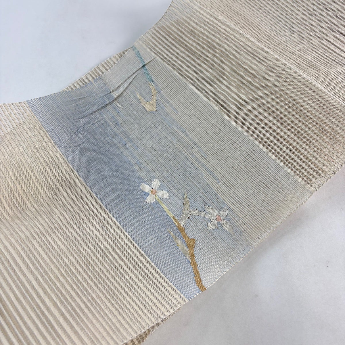 名古屋帯 秀品 夏帯 絽 八寸名古屋帯 草花 縞 ベージュ 正絹
