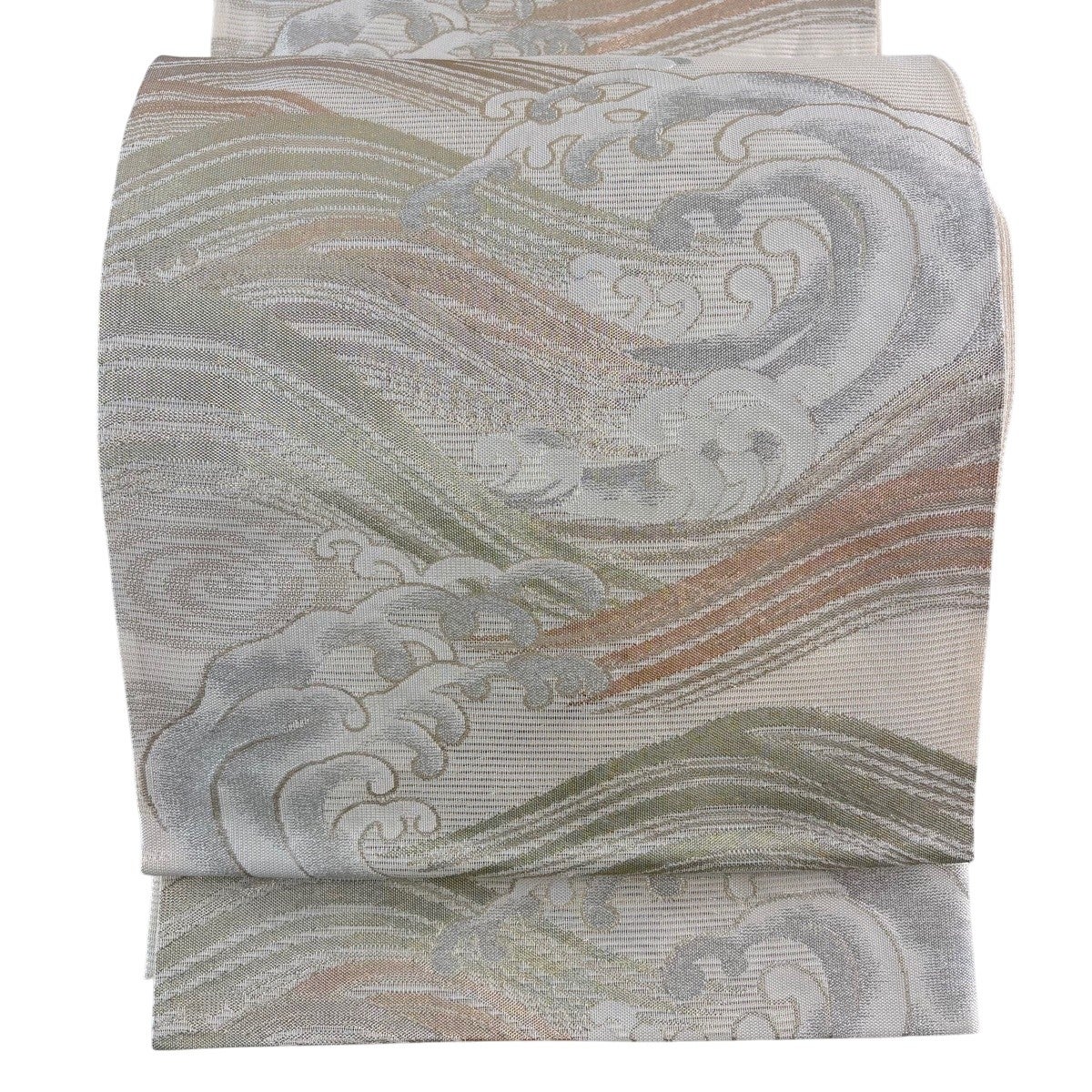 袋帯 秀品 夏帯 絽 波頭 銀糸 箔 ベージュ 六通 正絹