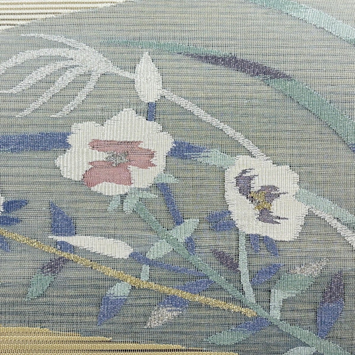 【美品】 名古屋帯 秀品 夏帯 絽 八寸名古屋帯 松葉仕立て 花 幾何学模様 金銀糸 灰緑 正絹