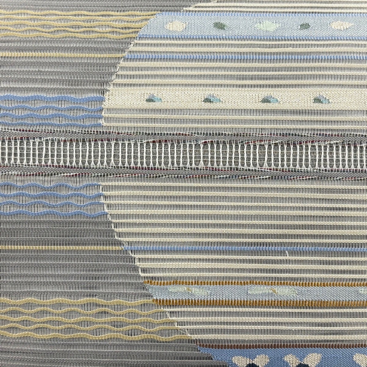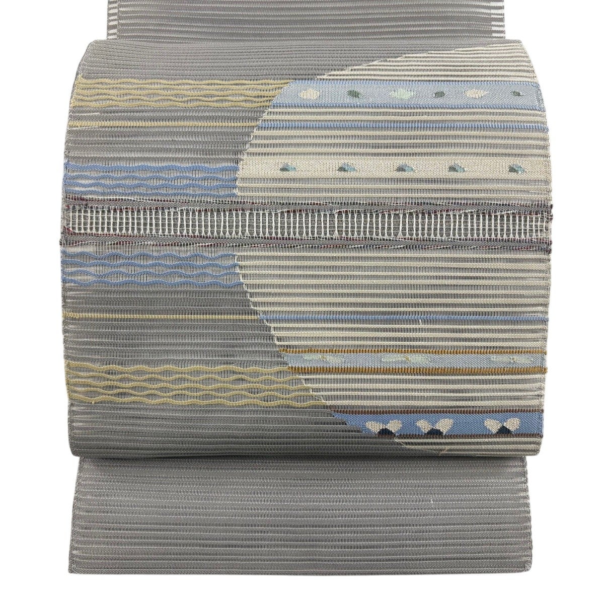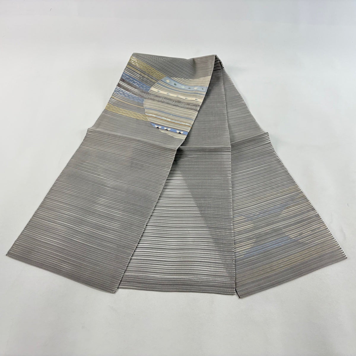 【美品】 袋帯 秀品 夏帯 絽 幾何学模様 縞 箔 青灰色 六通 正絹