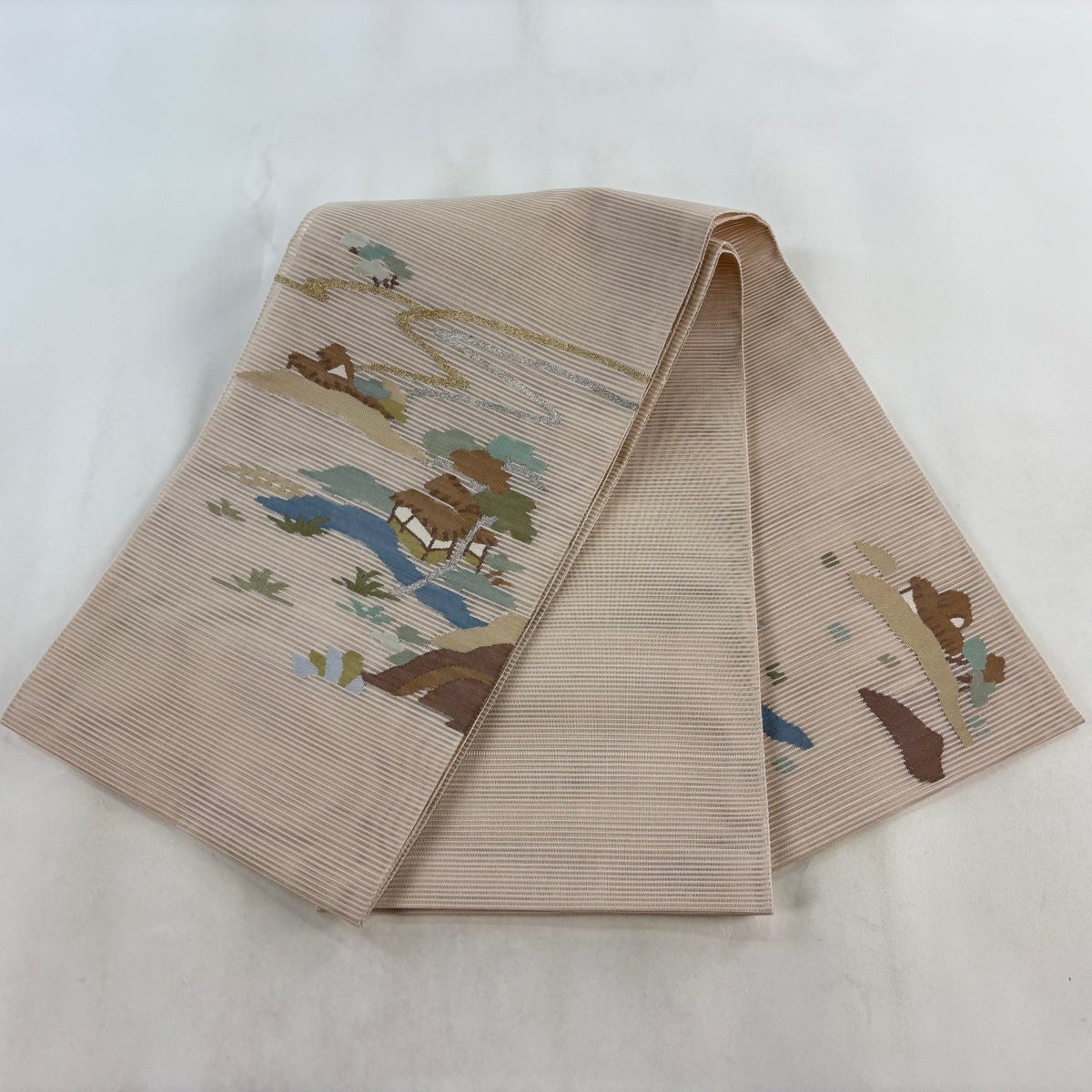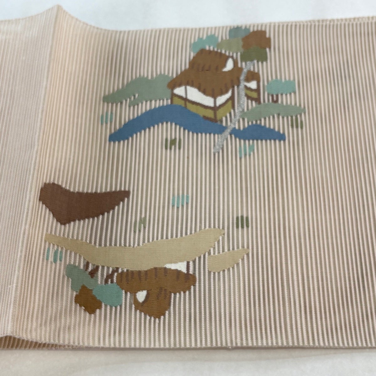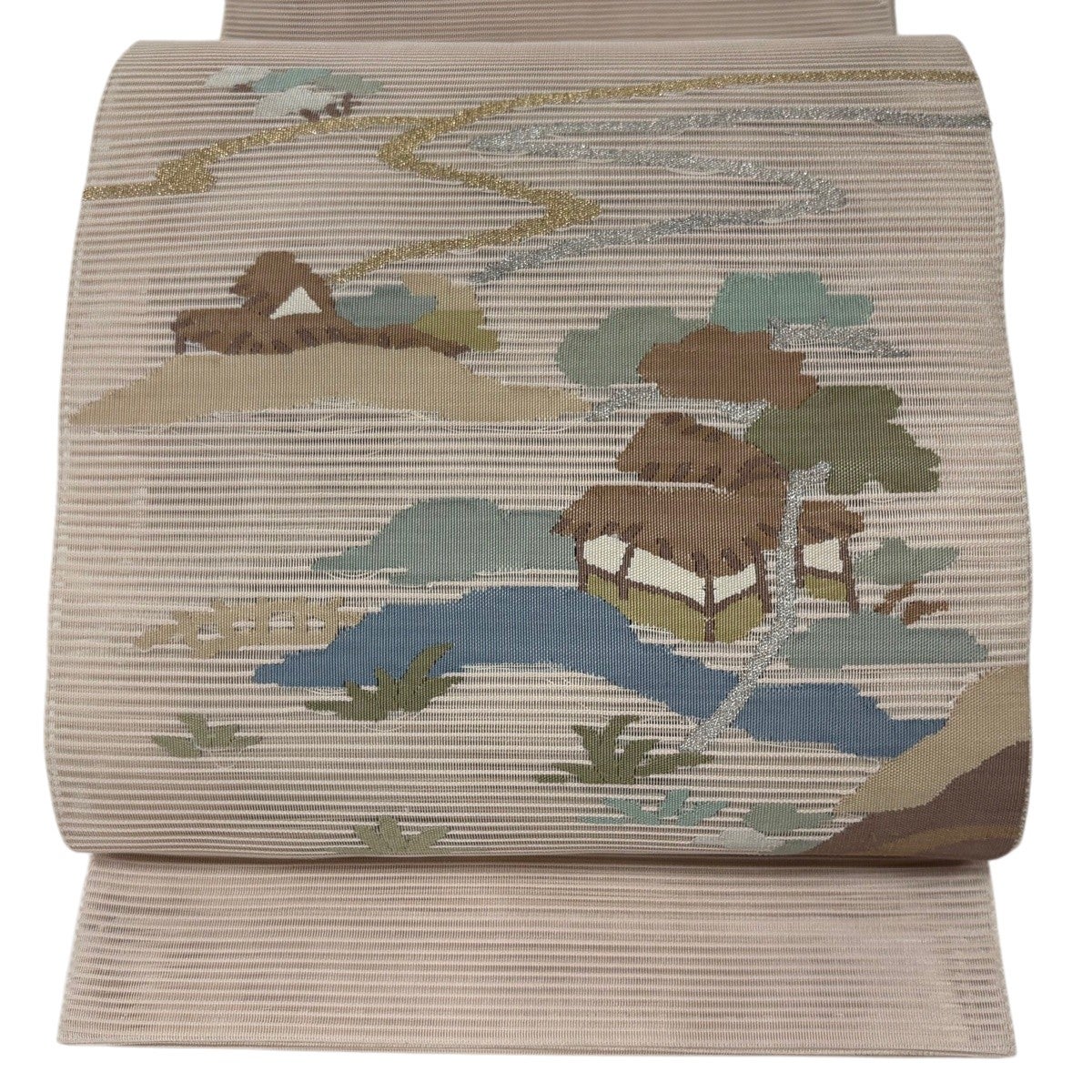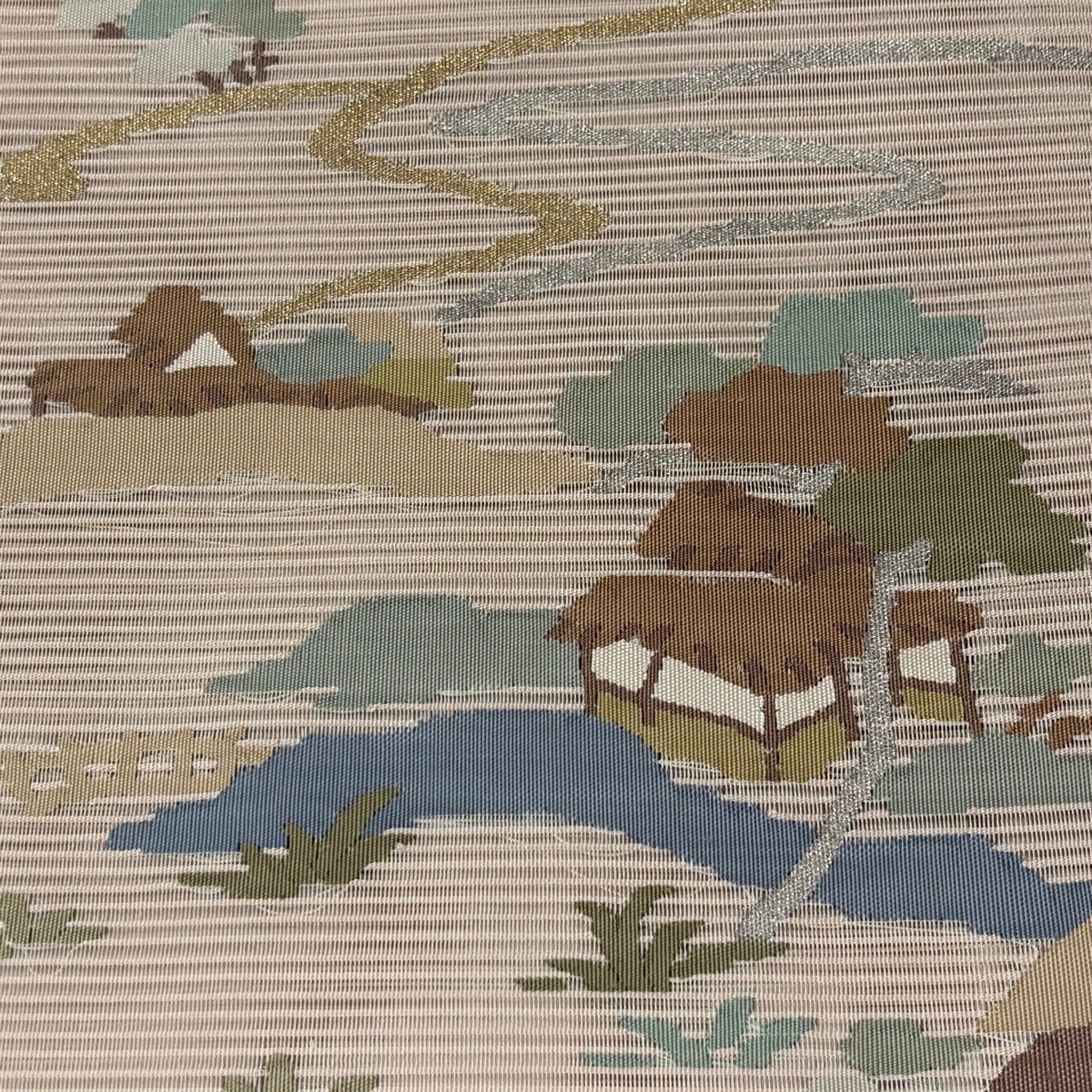 袋帯 秀品 夏帯 絽 風景 樹木 金銀糸 ベージュ お太鼓柄 正絹