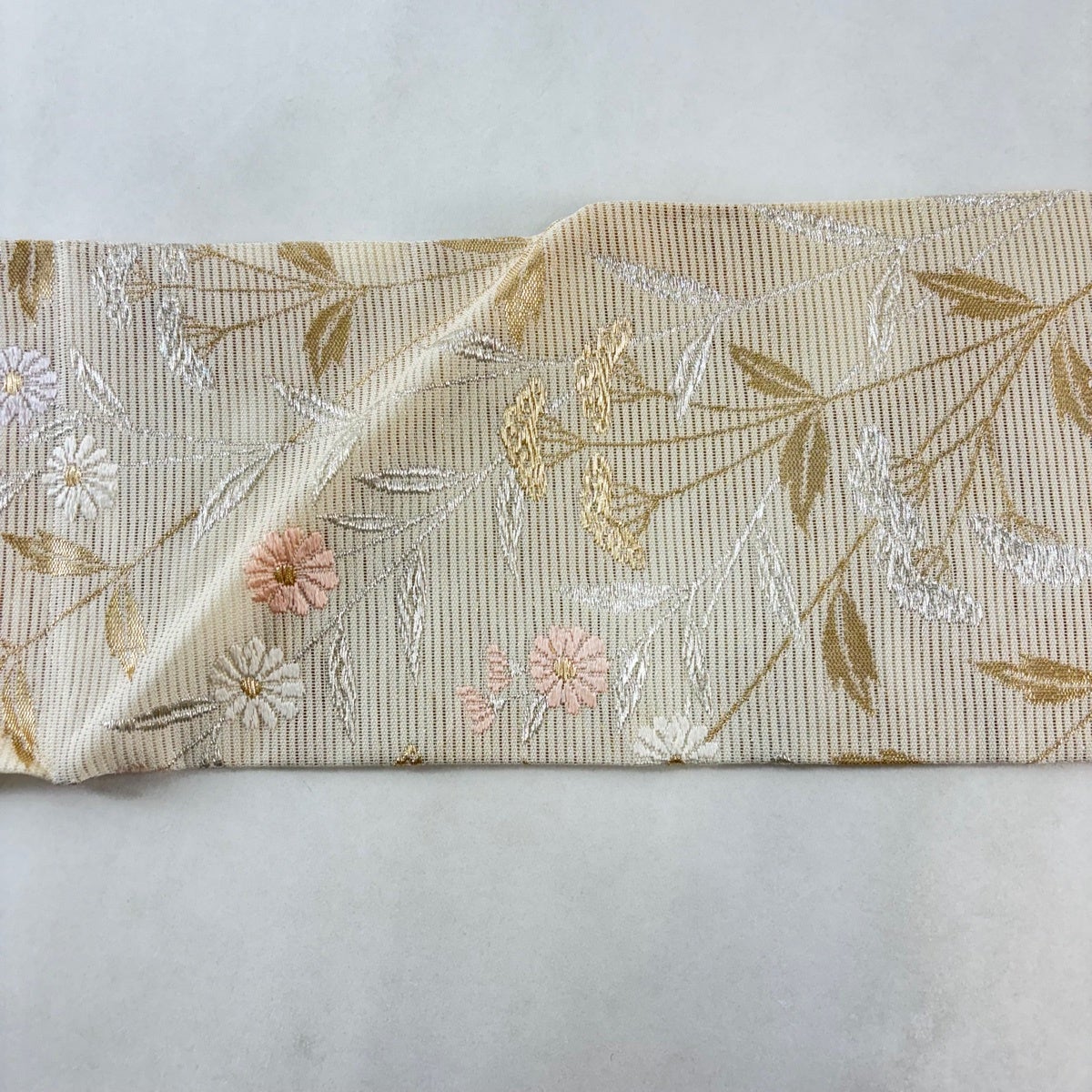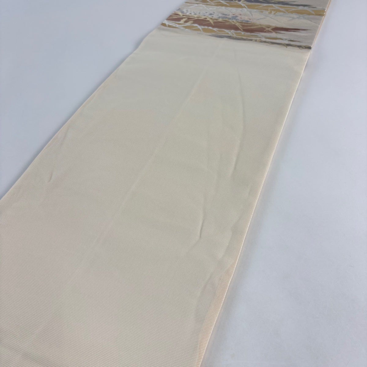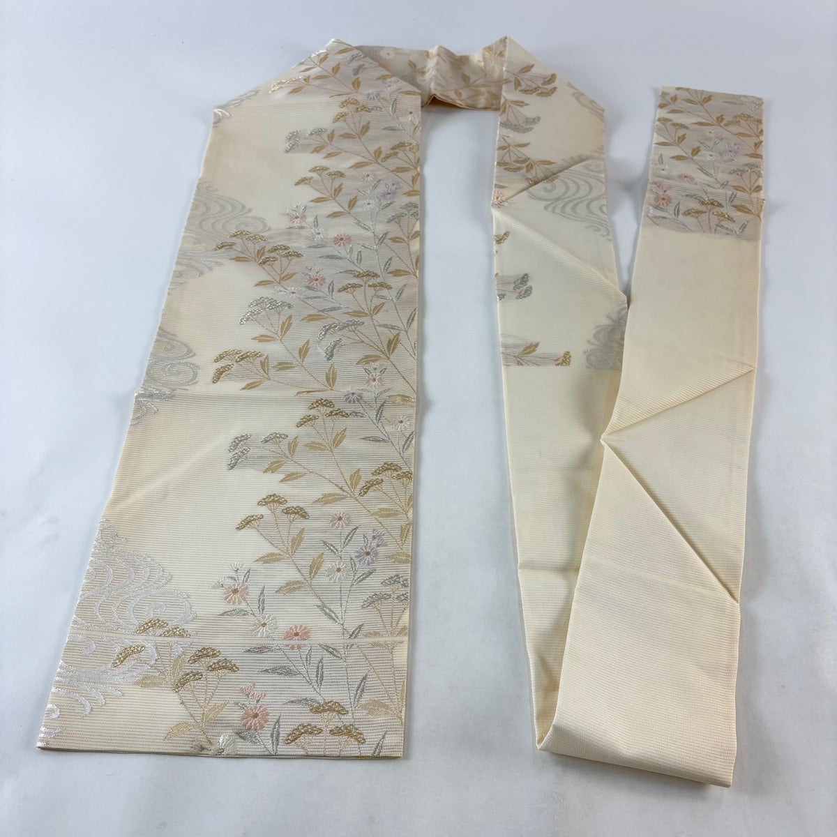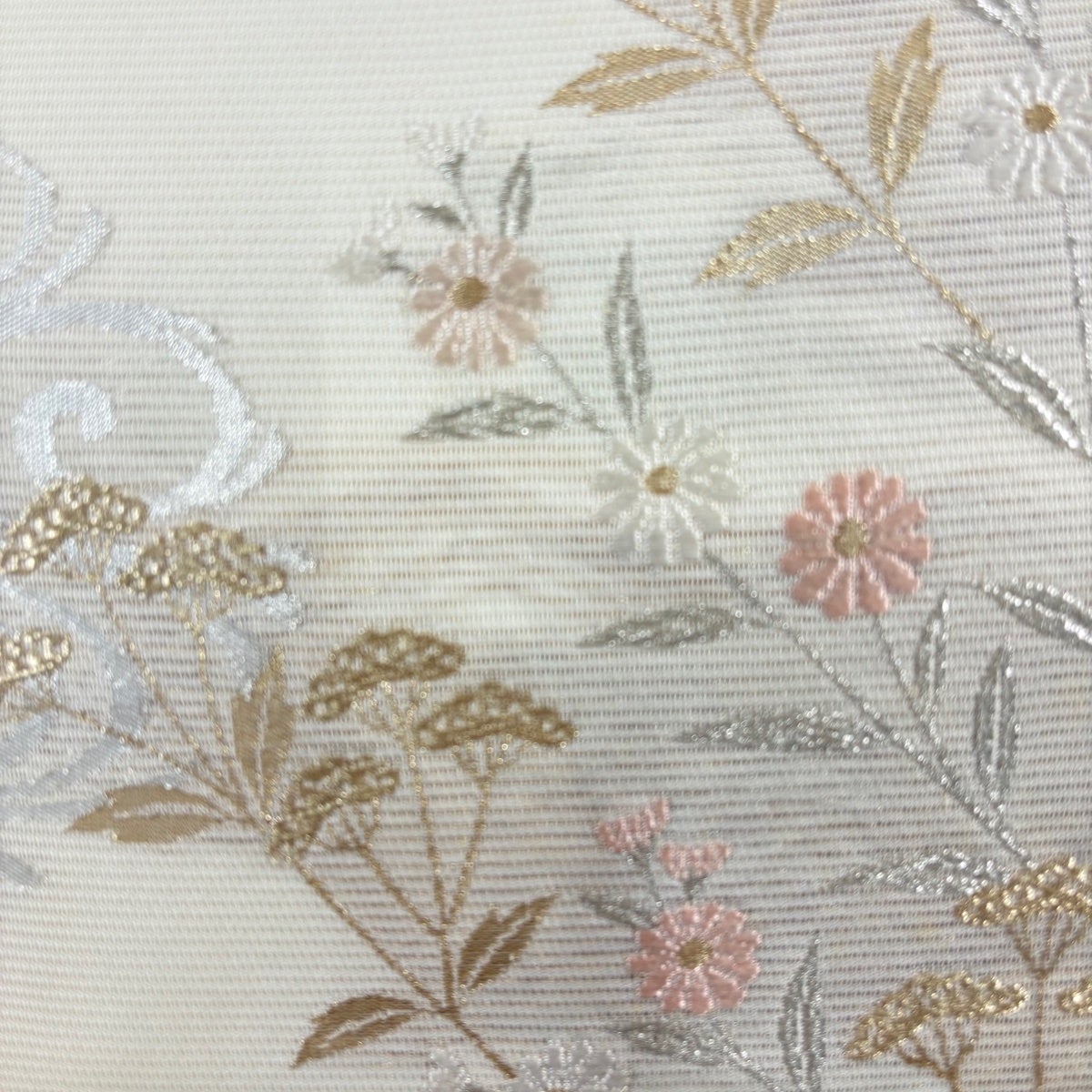 名古屋帯 秀品 八寸名古屋帯 夏帯 絽 草花 幾何学 金銀糸 クリーム 正絹