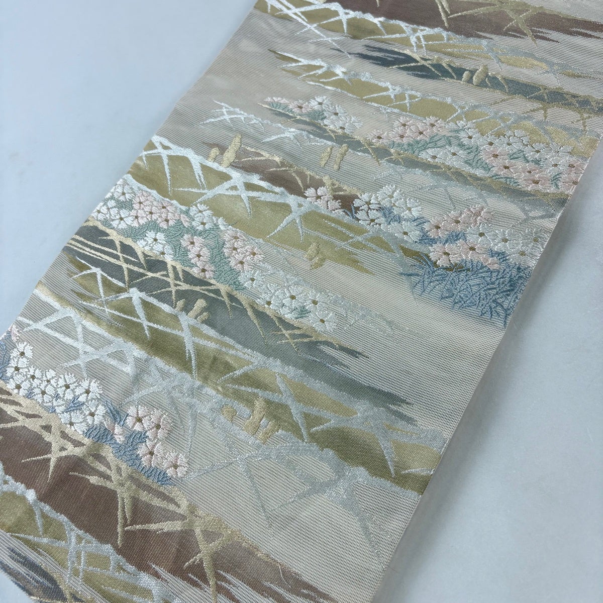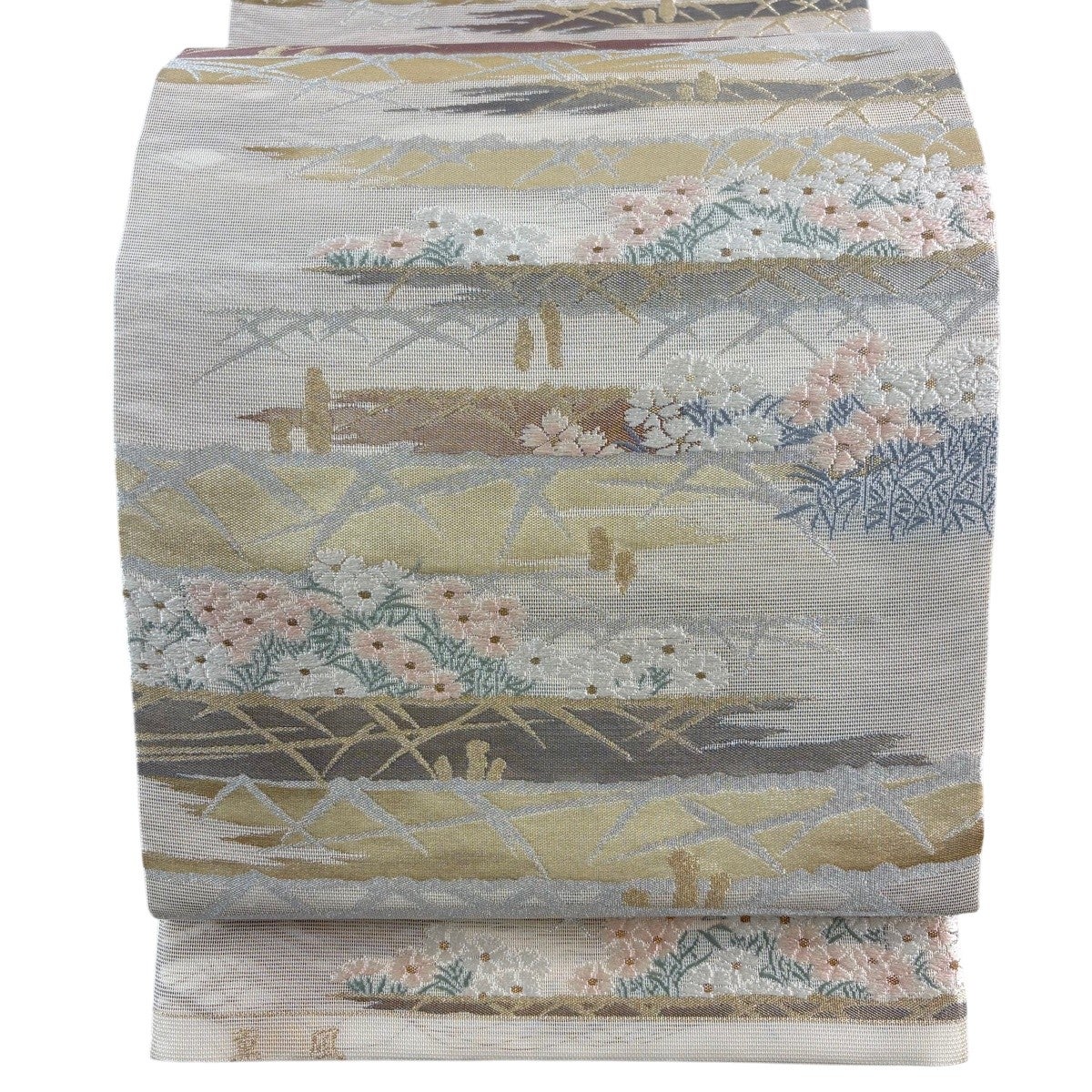 名古屋帯 秀品 夏帯 絽 草花 流水 金銀糸 唐織 ベージュ 正絹