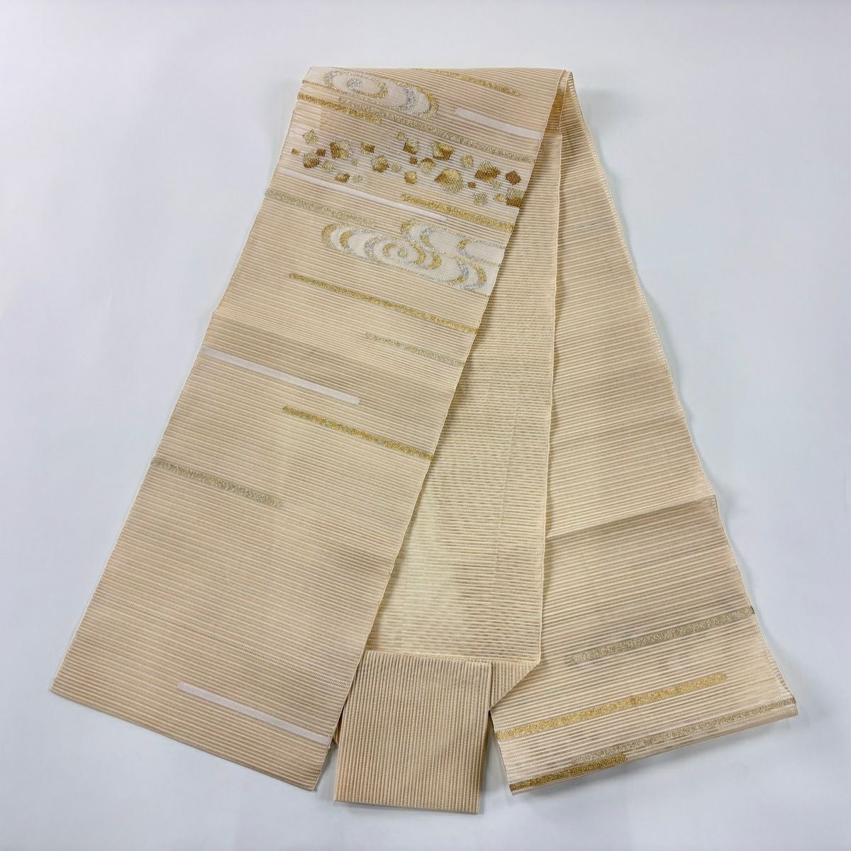 名古屋帯 秀品 夏帯 絽 縞 幾何学模様 金銀糸 ベージュ 正絹