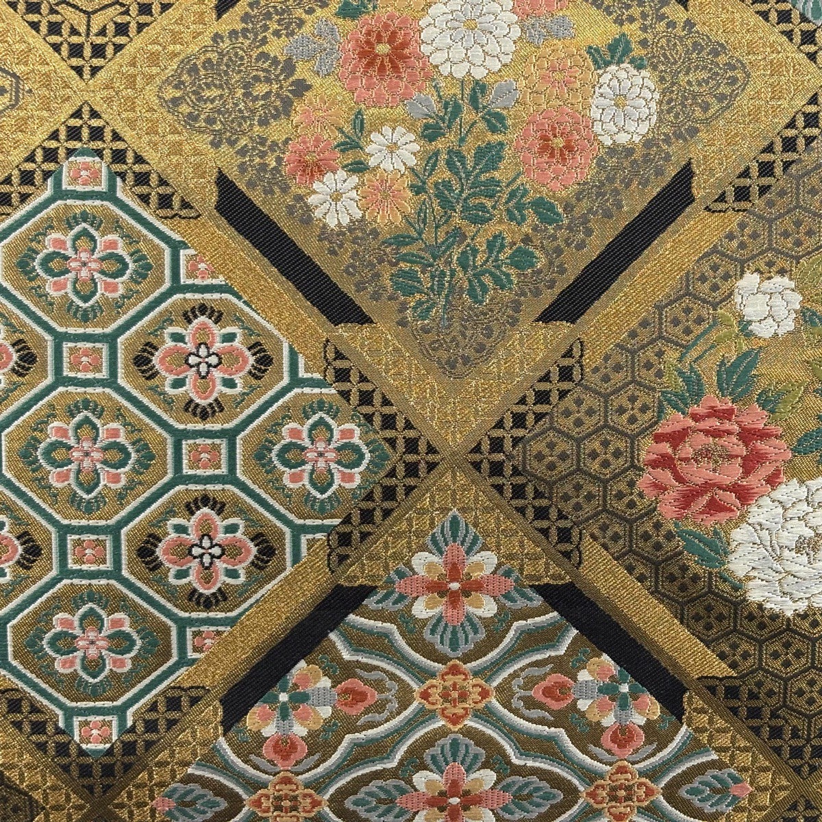 袋帯 秀品 鏡裏文 花唐草 金糸 箔 黒 六通 正絹