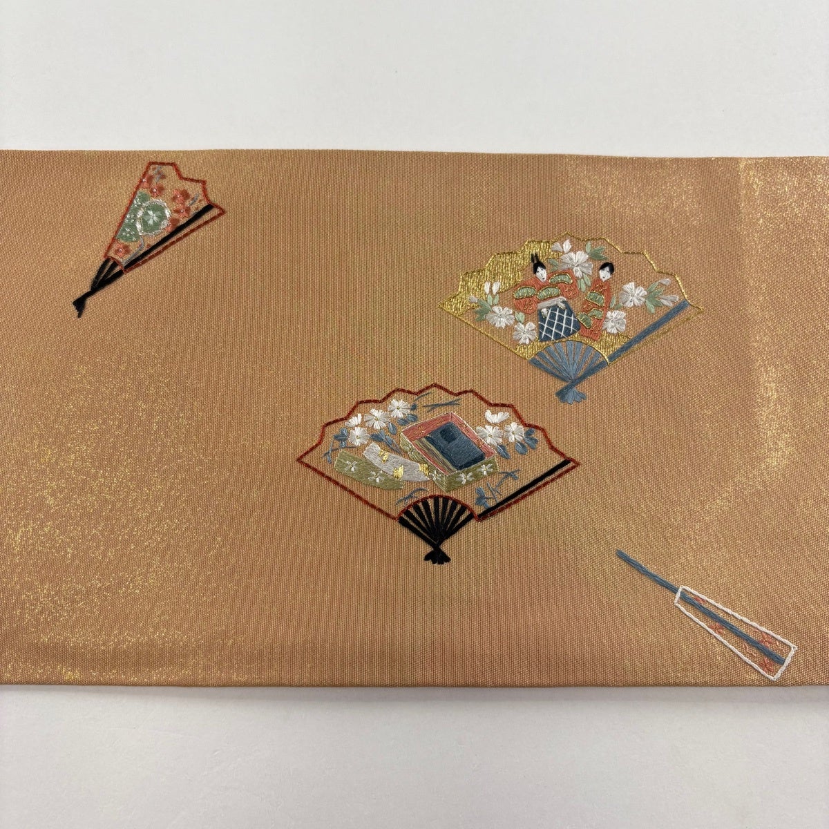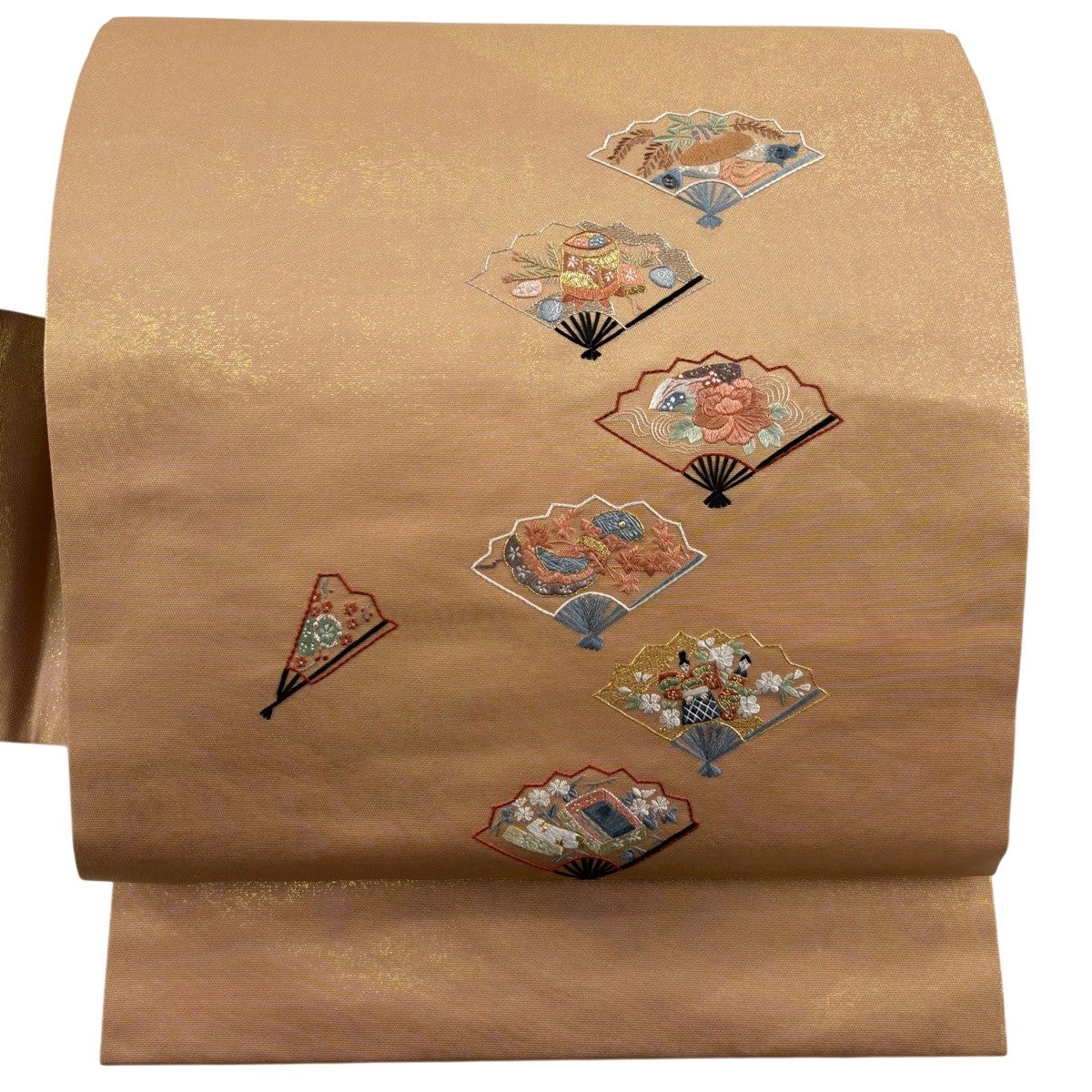 袋帯 秀品 扇 菊 唐織 箔 ベージュ 六通 正絹