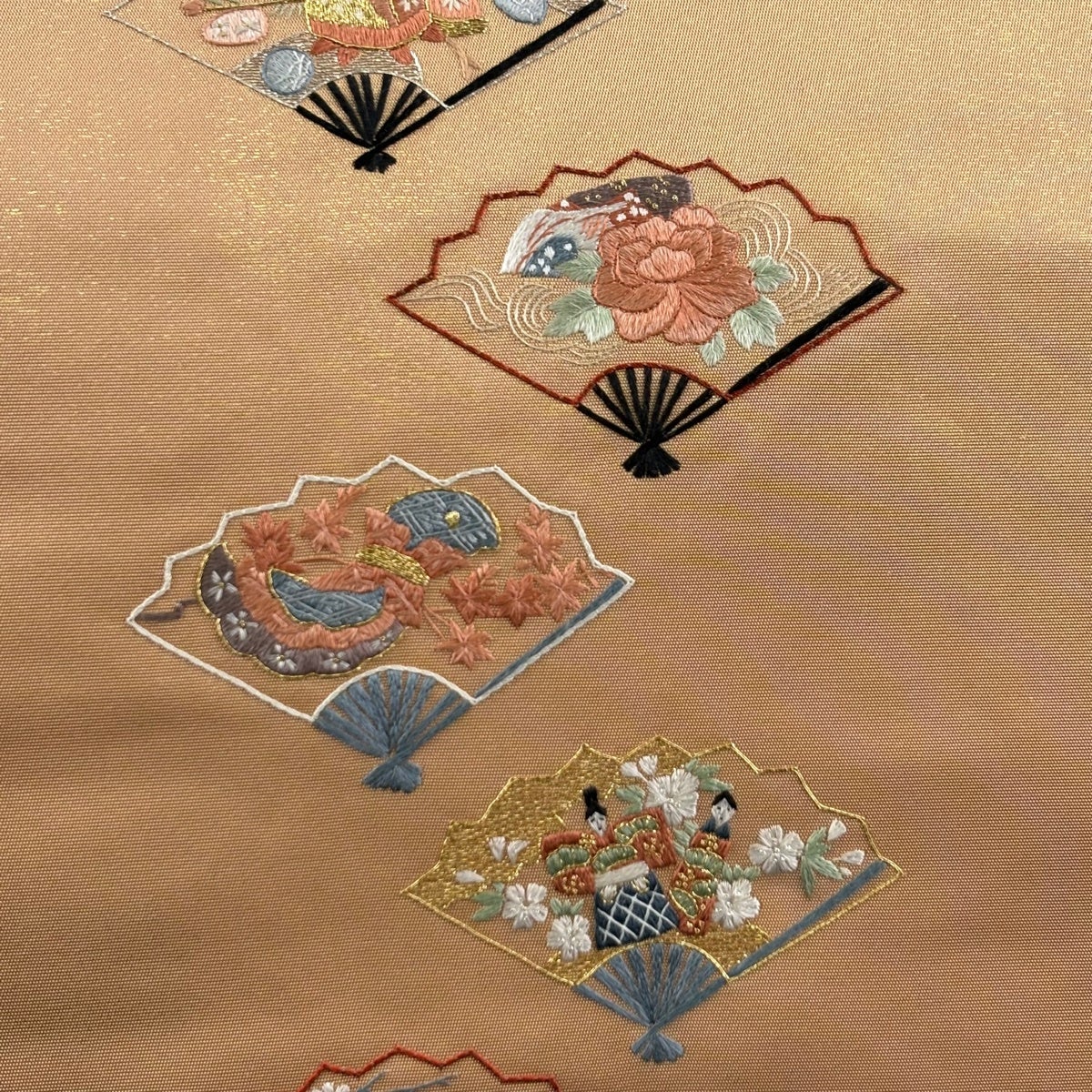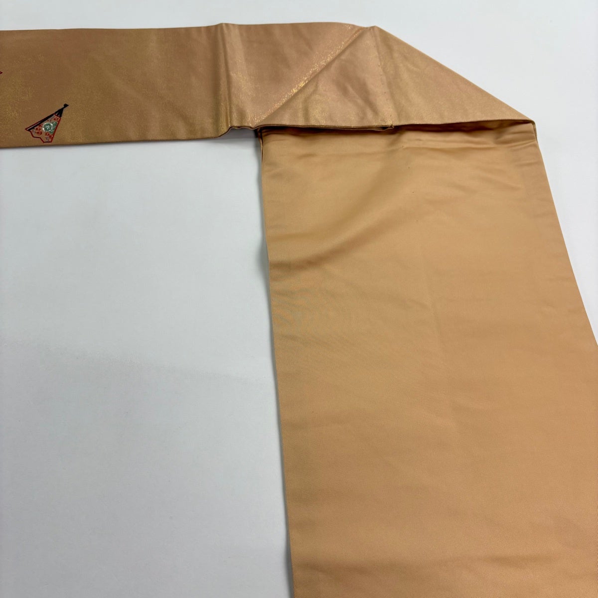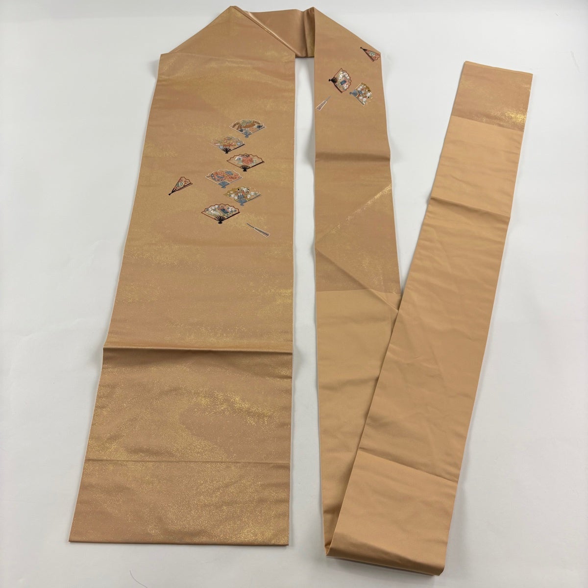 袋帯 秀品 扇 草花 金糸 唐織 ベージュ 六通 正絹