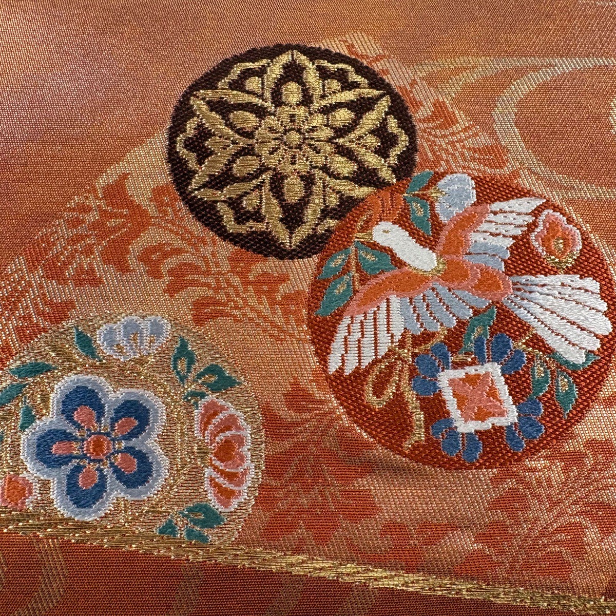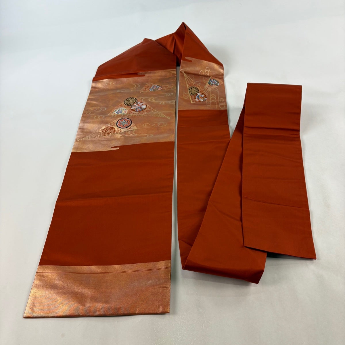 袋帯 名品 関西仕立て 扇 萩 刺繍 箔 赤茶 六通 正絹