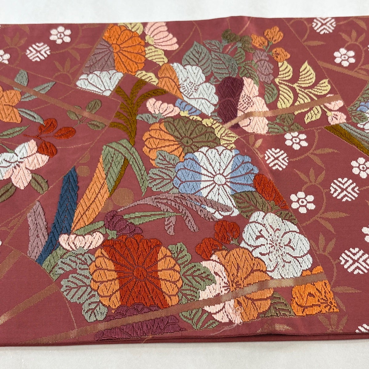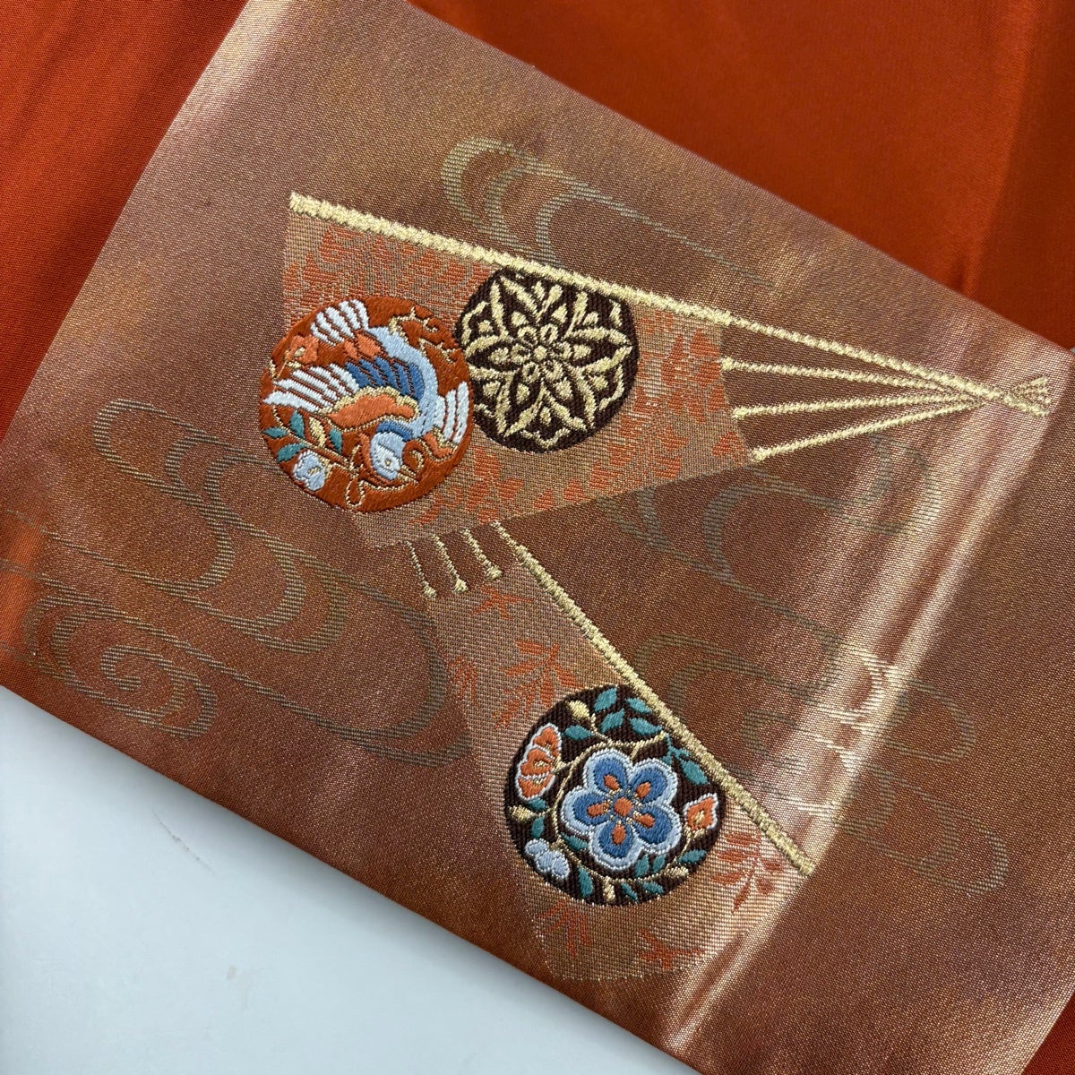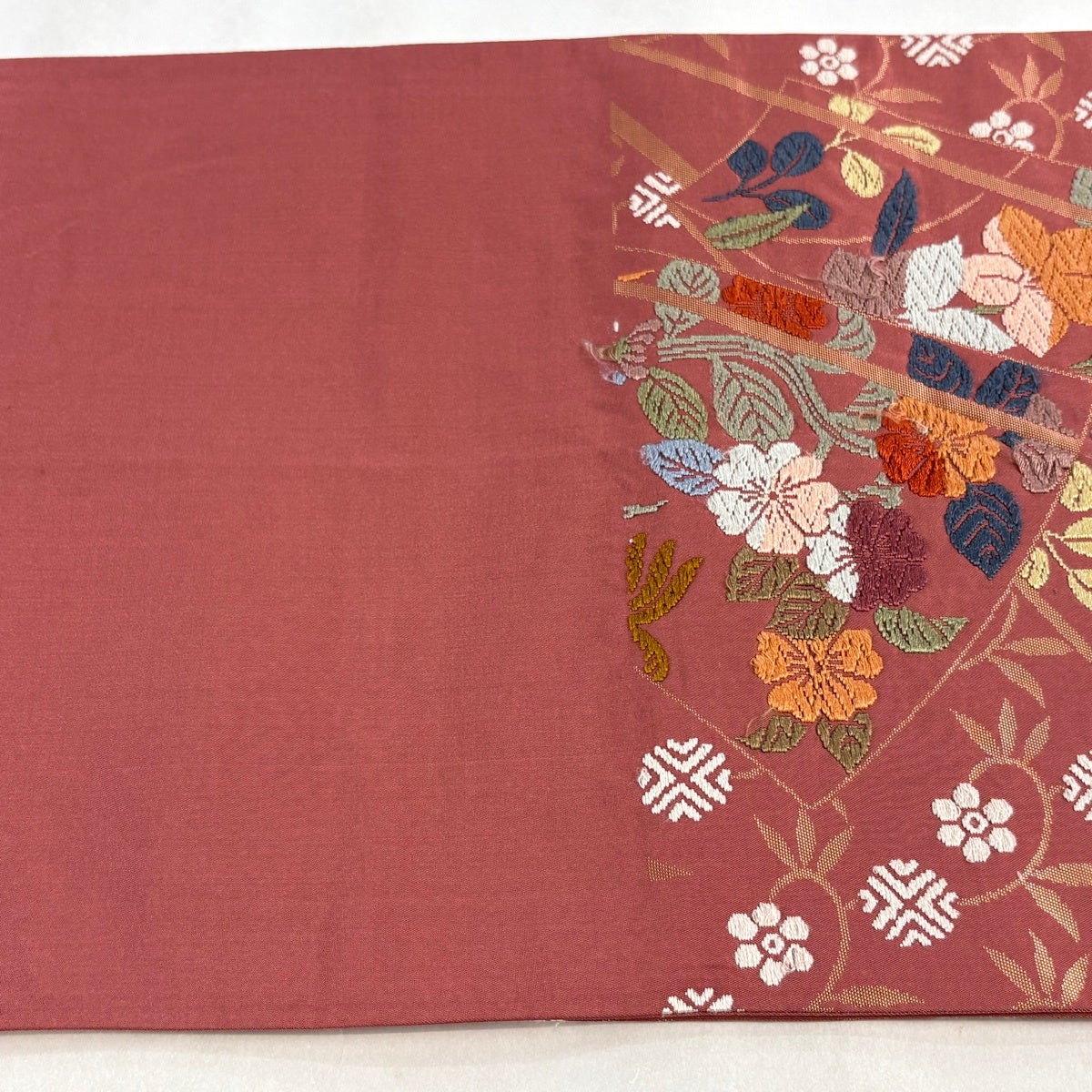 袋帯 秀品 紬地 扇 草花 刺繍 赤茶 お太鼓柄 正絹