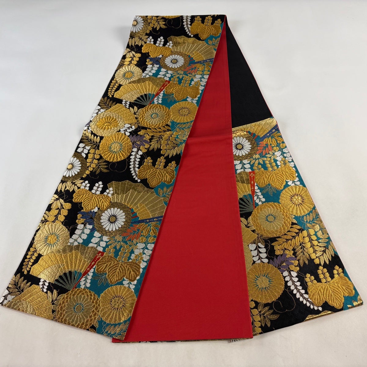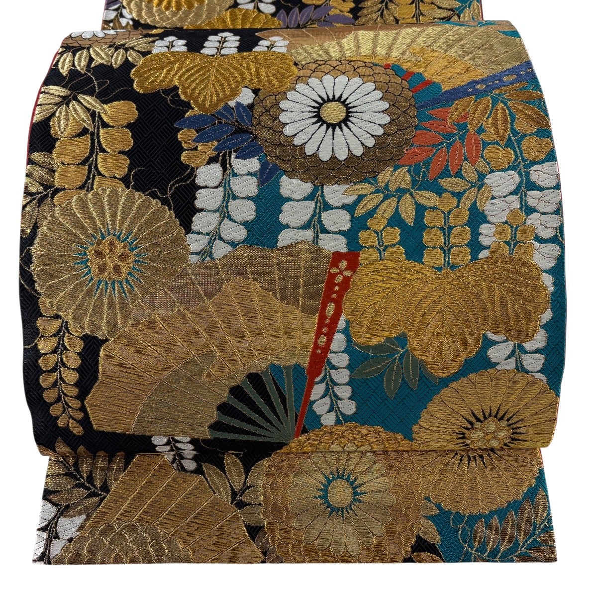 袋帯 秀品 関西仕立て 扇 蝶 金糸 箔 墨色 六通 正絹