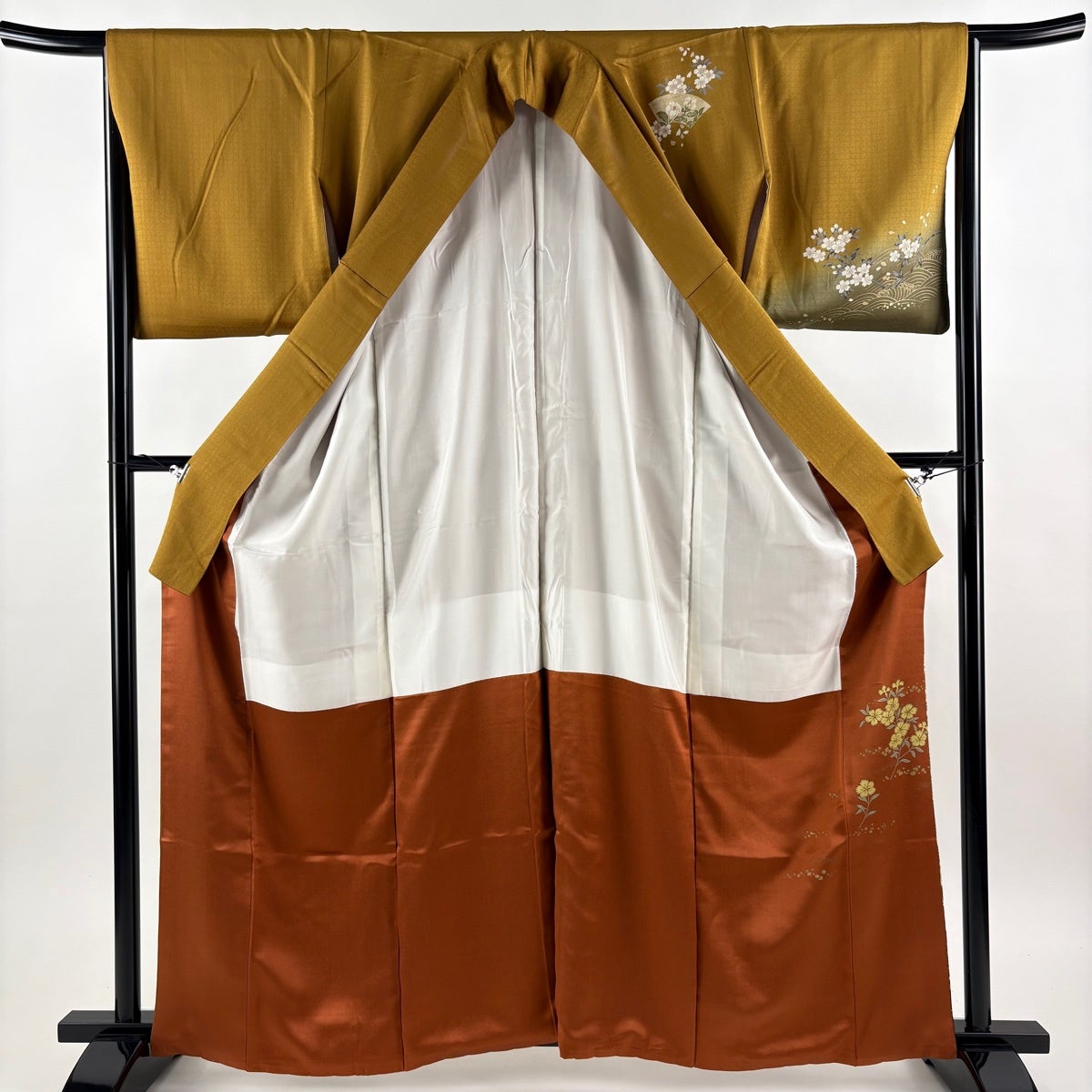 付下げ 身丈162cm 裄丈66cm M 袷 扇面 草花 金彩 染め分け 山吹茶色 正絹 秀品