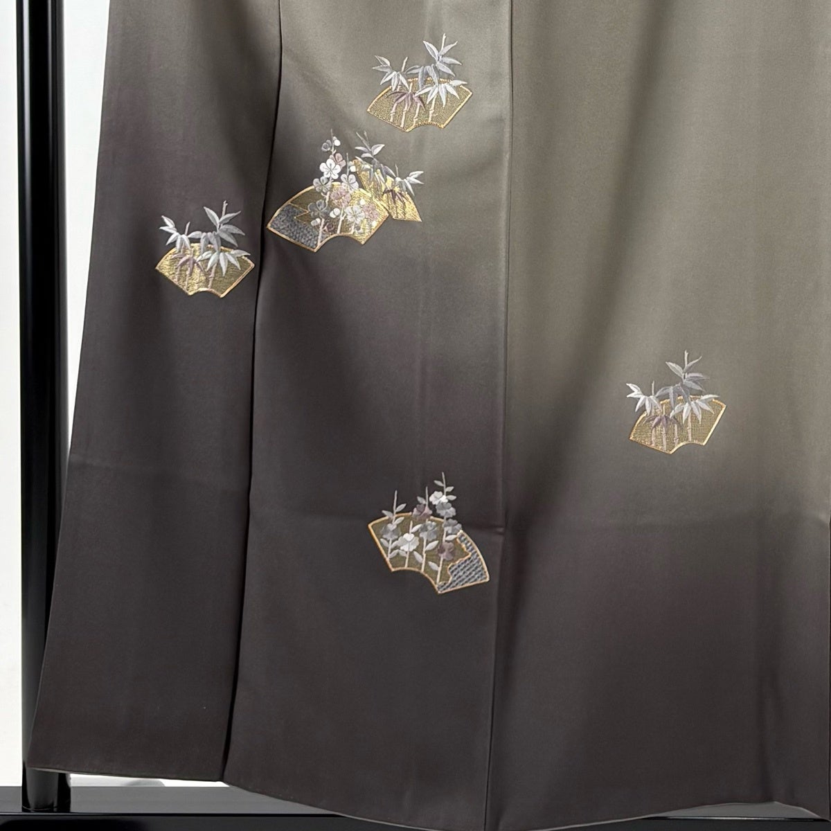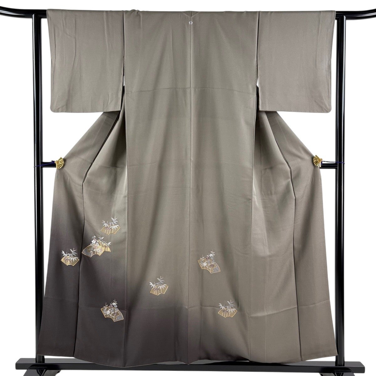 付下げ 身丈156.5cm 裄丈62cm S 袷 扇面 笹 刺繍 金糸 灰茶 正絹 秀品 一つ紋