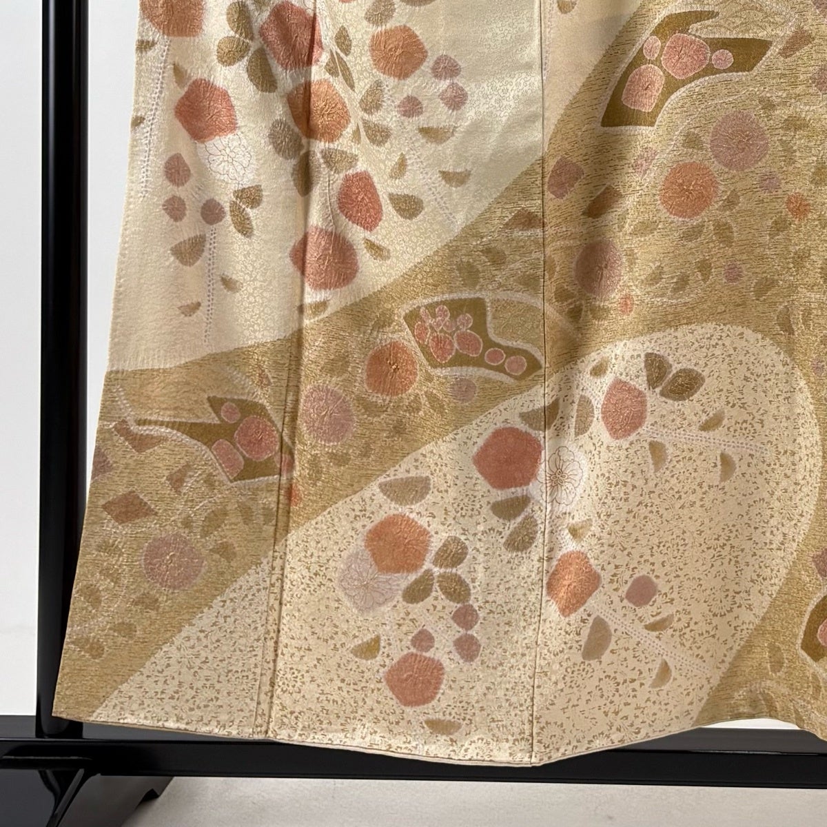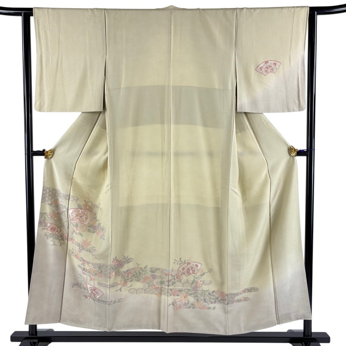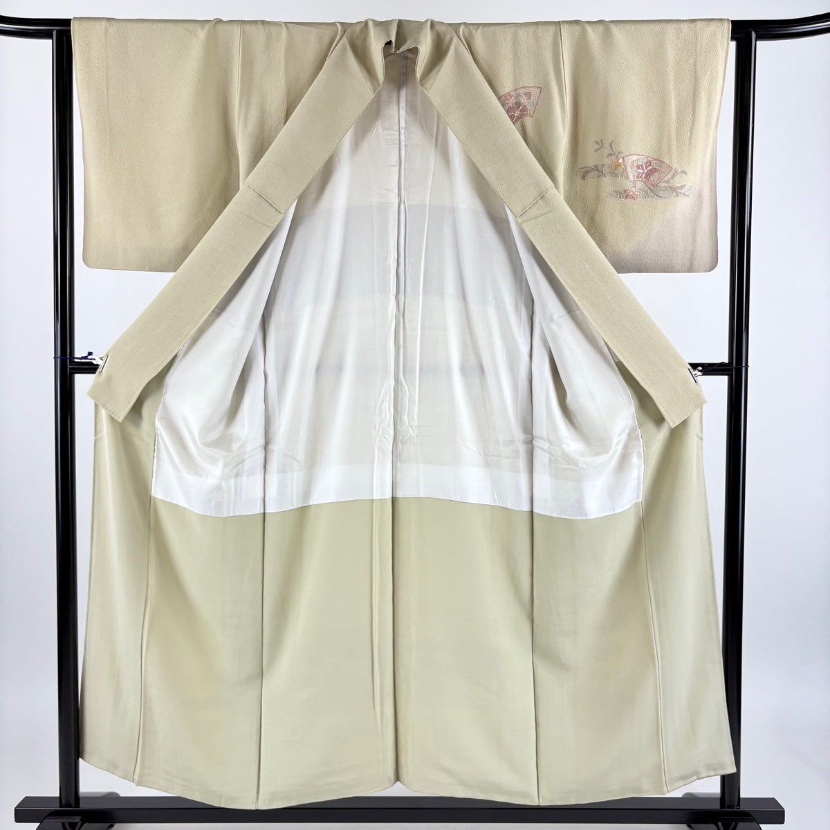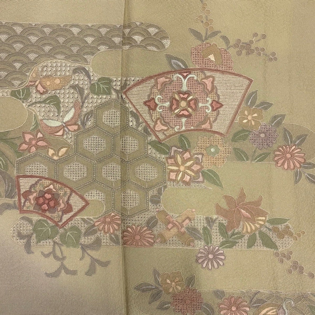 付下げ 身丈161cm 裄丈64cm M 袷 扇面 草花 刺繍 金彩 ベージュ 正絹 優品