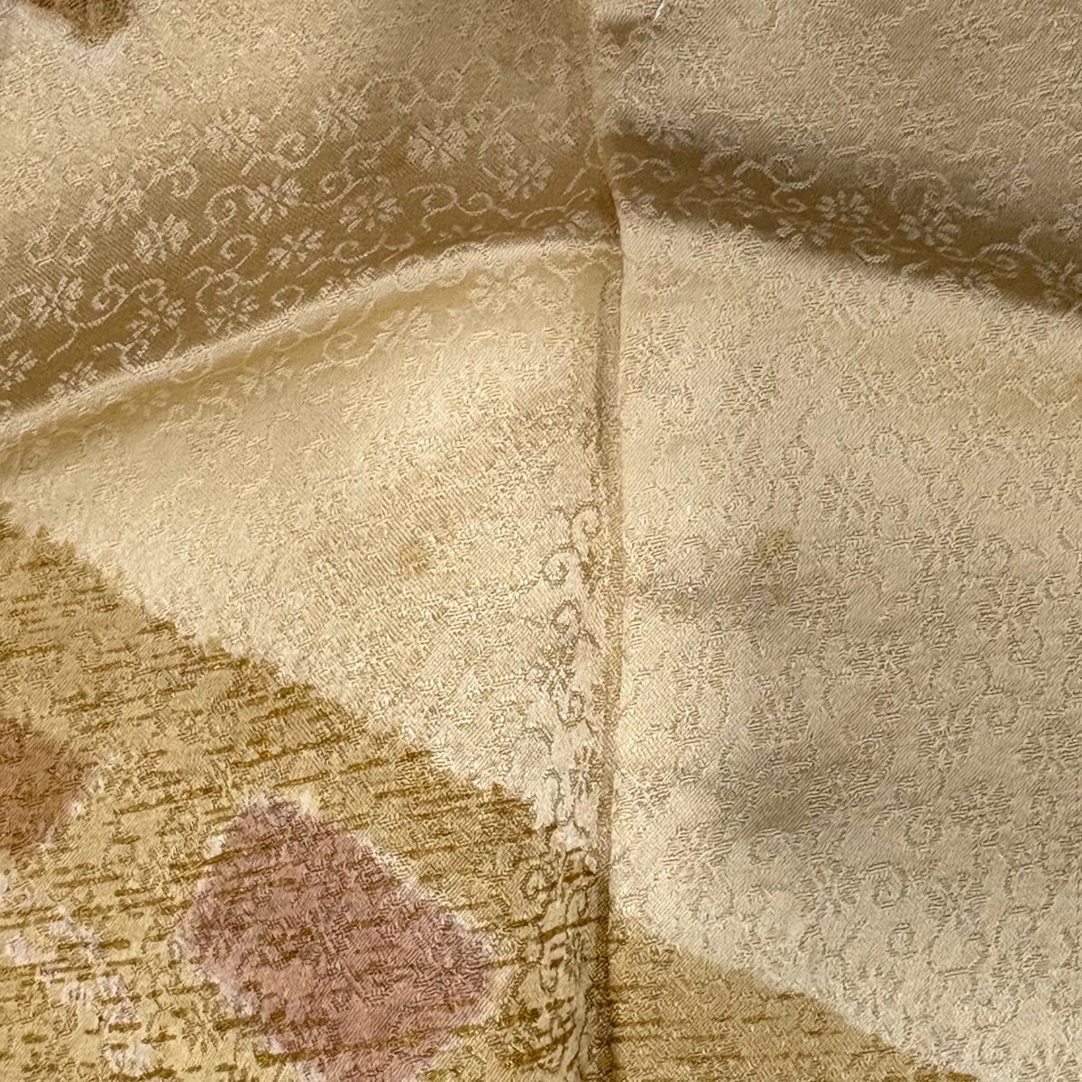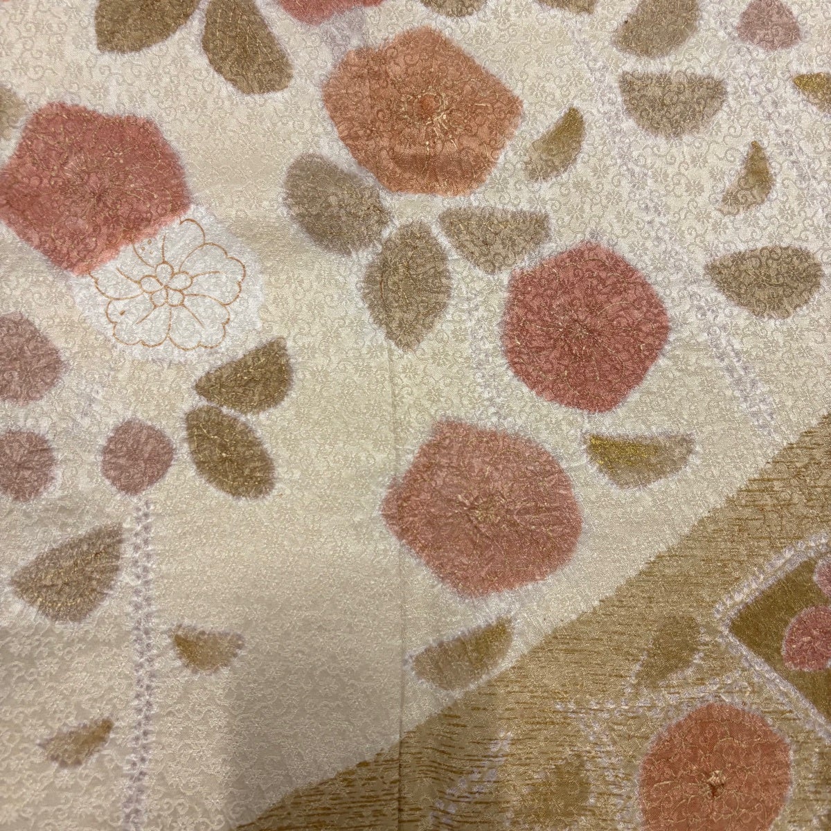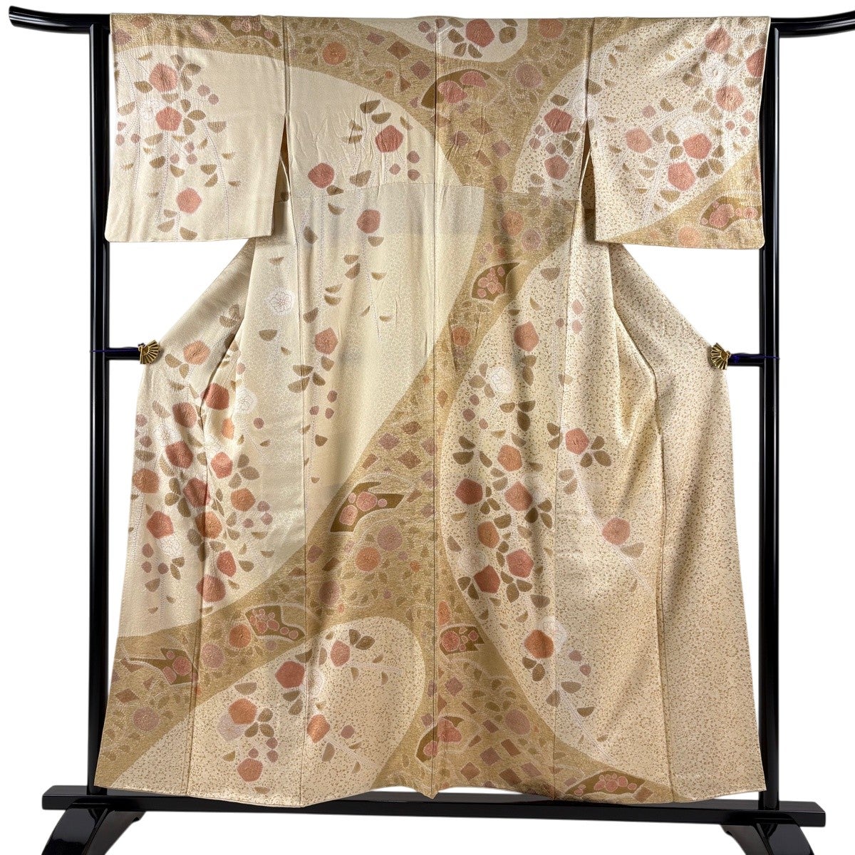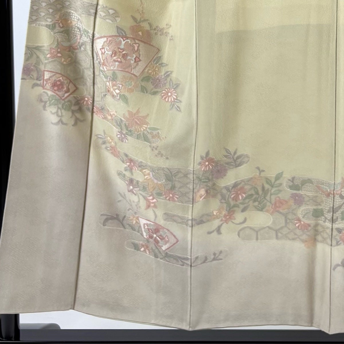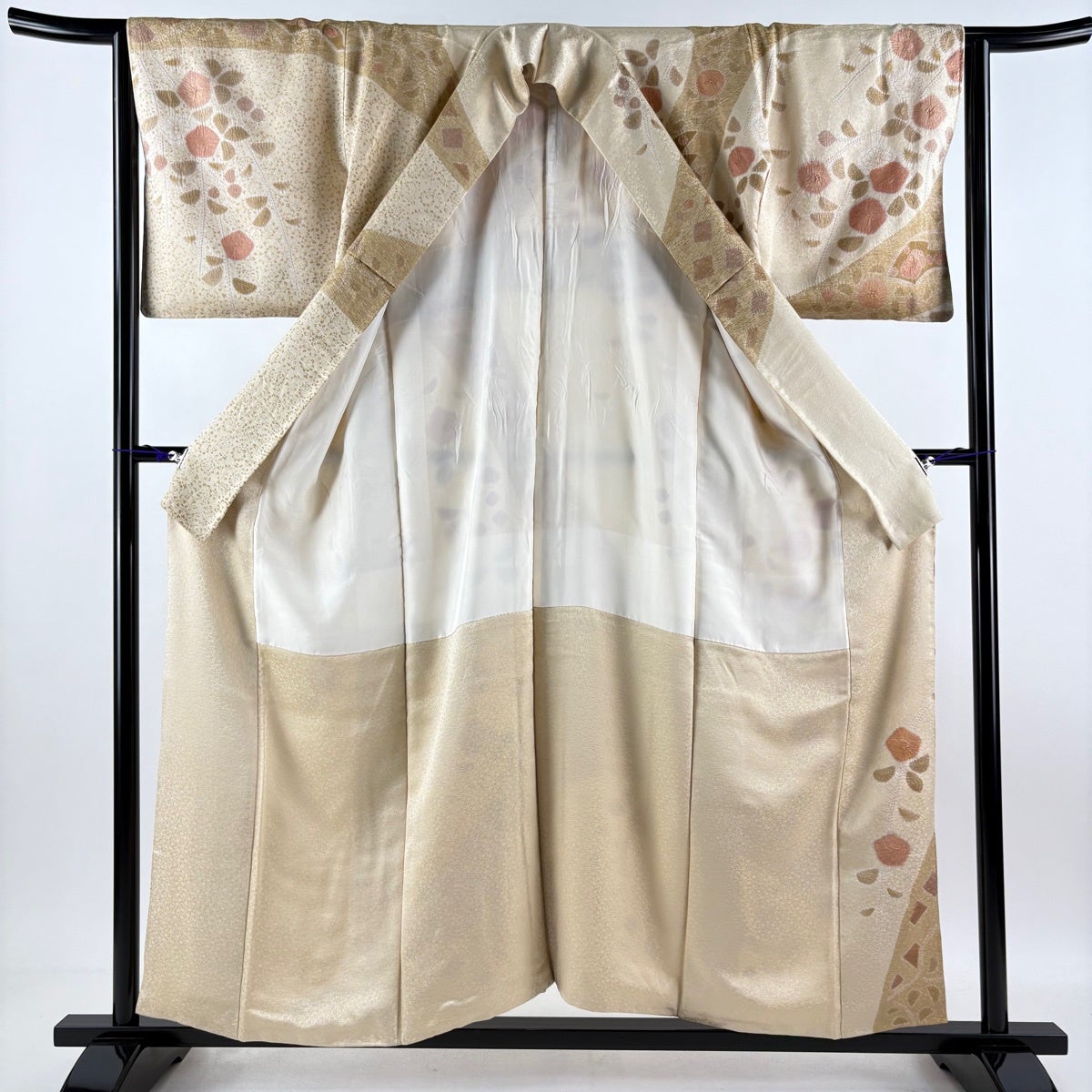 付下げ 身丈161cm 裄丈64cm M 袷 扇面 草花 刺繍 金彩 ベージュ 正絹 優品