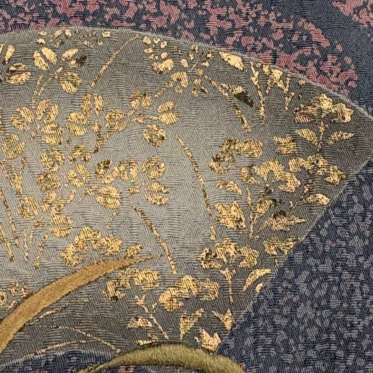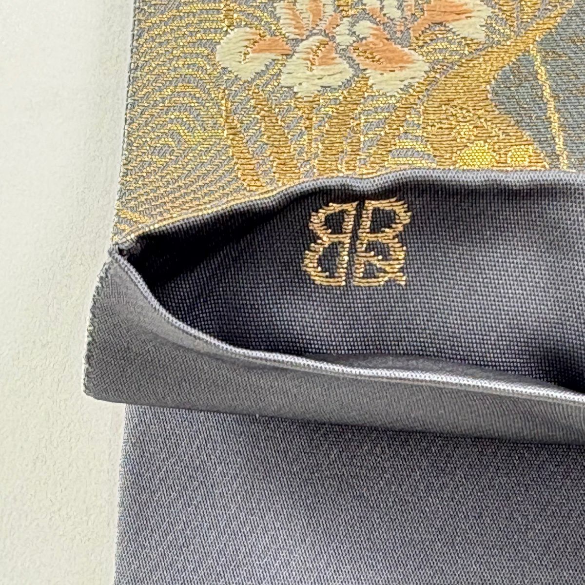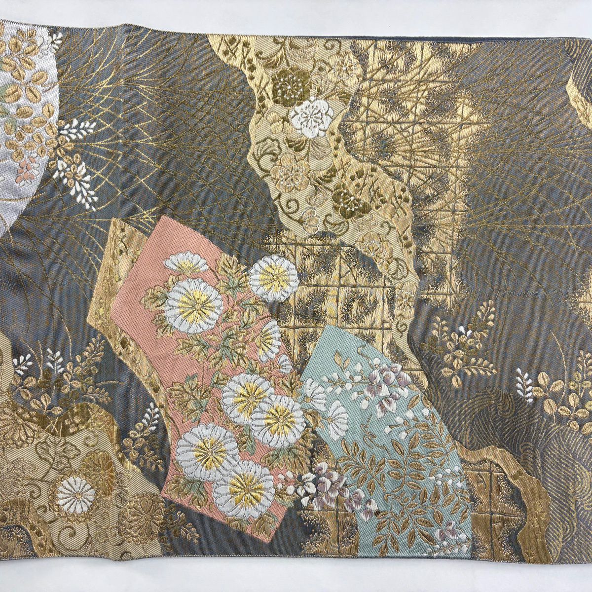 【美品】 袋帯 秀品 服部織物 落款あり 関西仕立て 扇面 草花 金糸 箔 灰色 六通 正絹