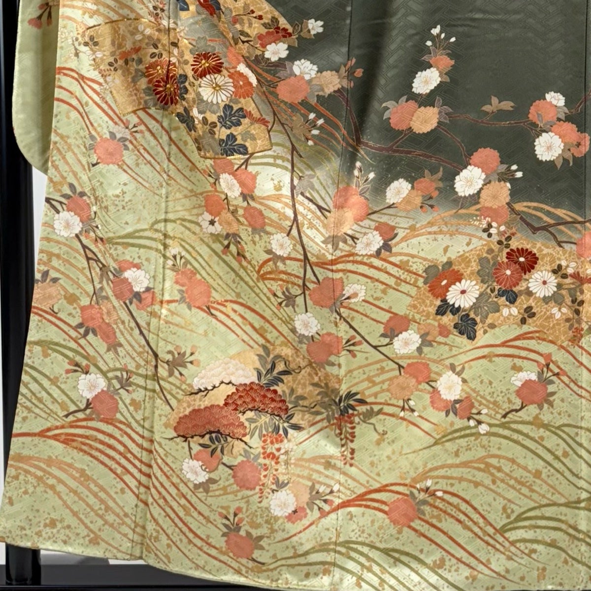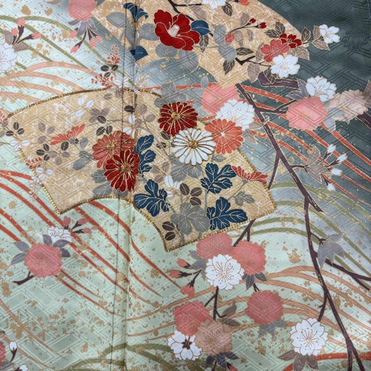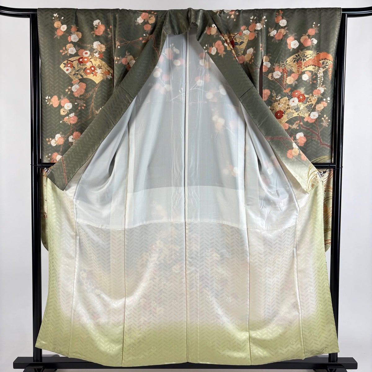 訪問着 身丈158cm 裄丈66cm M 袷 落款あり 扇面 草花 金糸 金彩 灰緑 正絹 名品