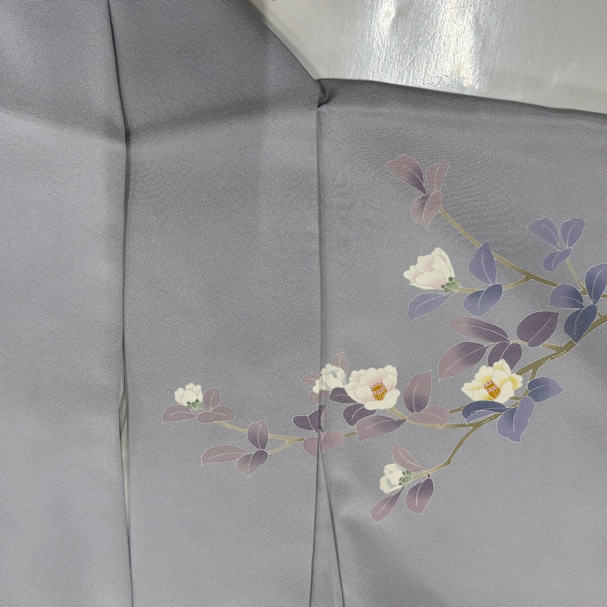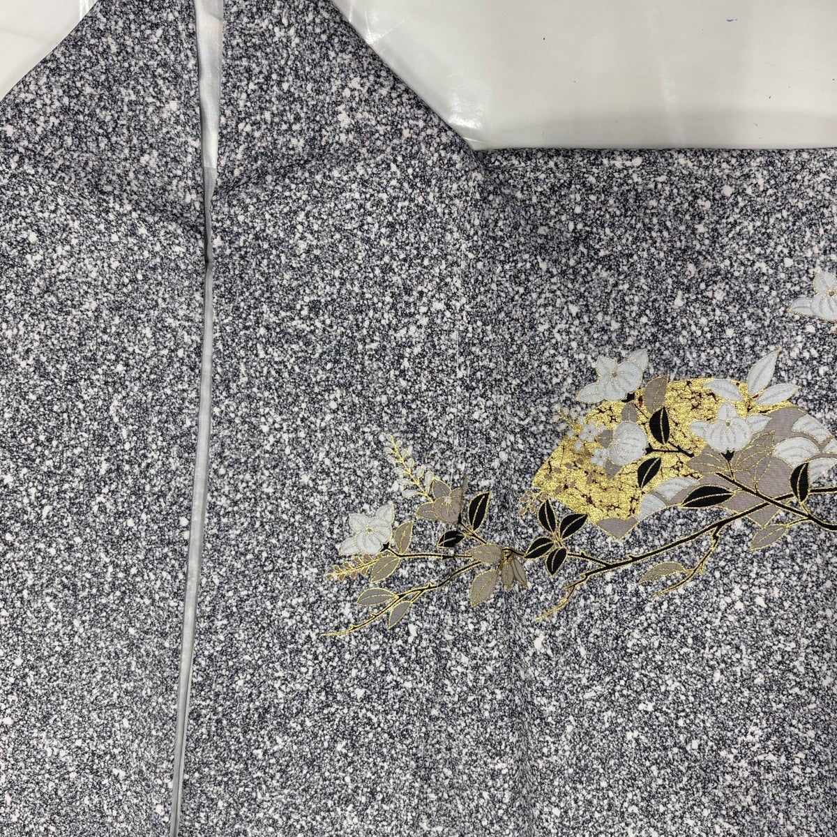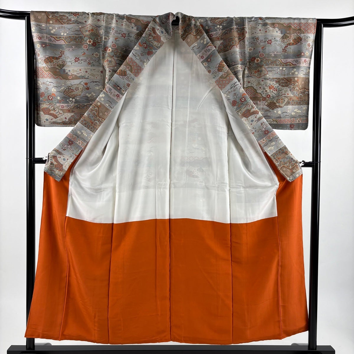 【美品】 訪問着 身丈166cm 裄丈66.5cm M 袷 扇面 枝花 金彩 ぼかし 灰色 正絹 秀品