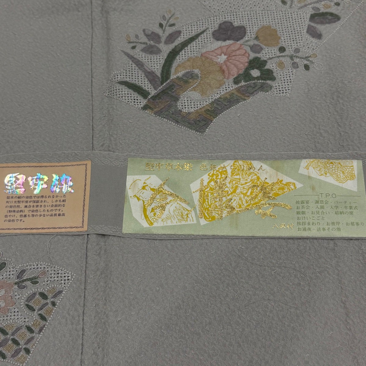 訪問着 身丈156cm 裄丈61cm S 袷 落款あり 扇面 枝花 金彩 ぼかし 灰色 正絹 秀品