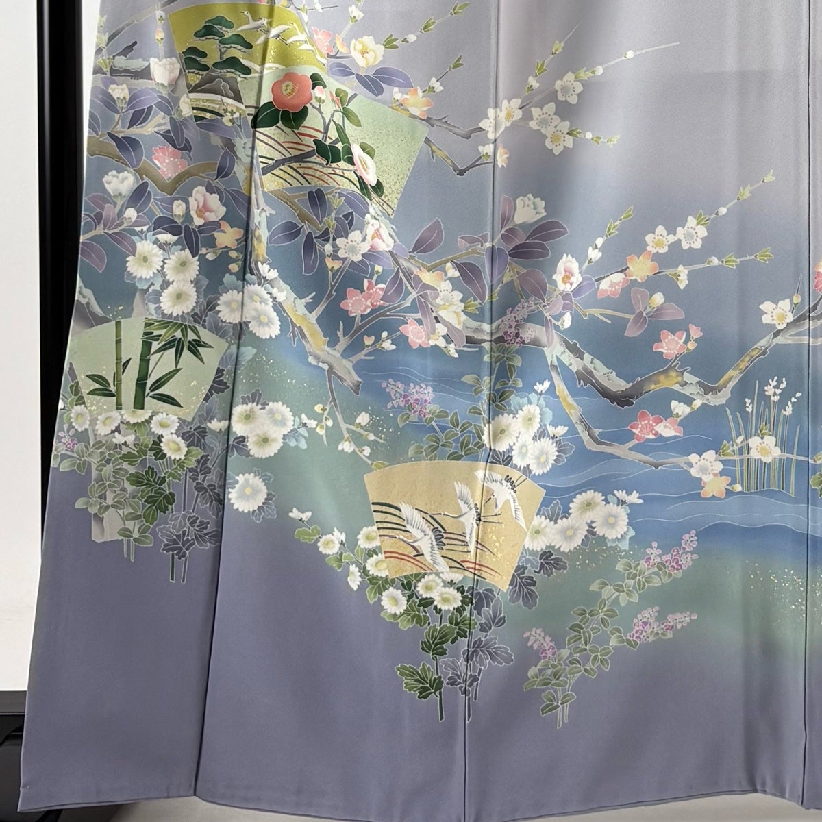訪問着 身丈165cm 裄丈68.5cm L 袷 落款あり 扇面 枝花 金彩 ぼかし 青灰色 正絹 名品