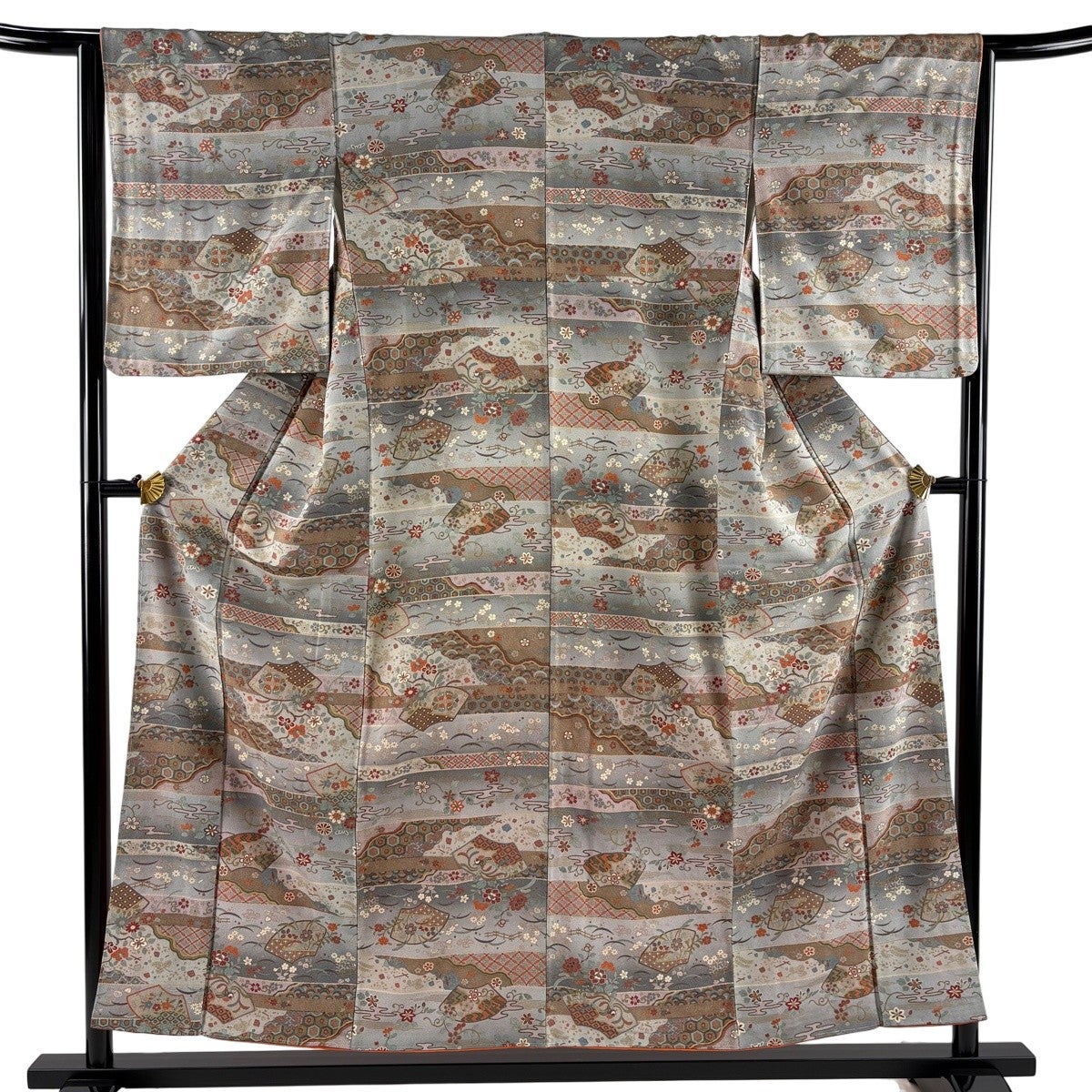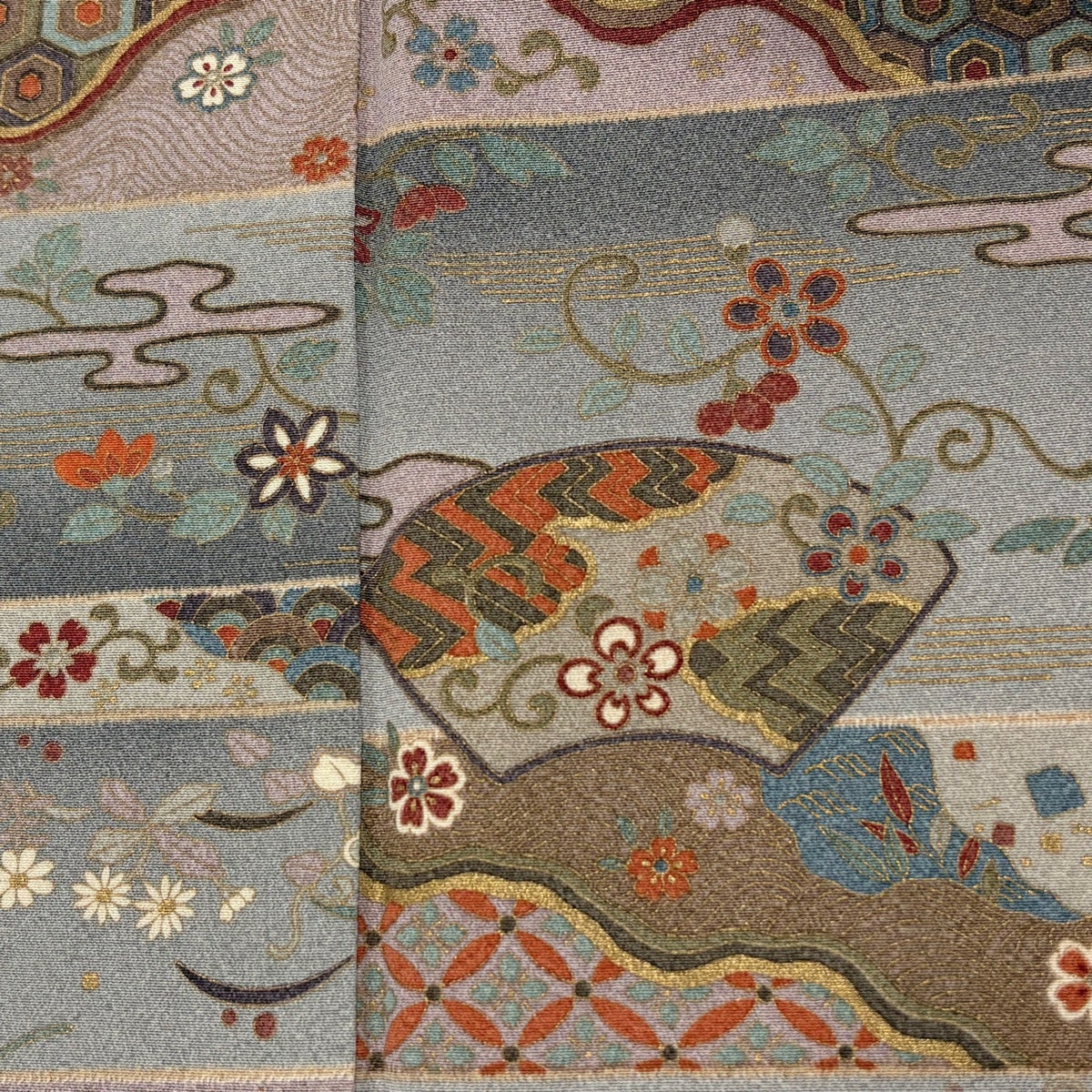 訪問着 身丈161.5cm 裄丈63.5cm S 袷 鈴乃屋 扇面 花鳥 金彩 ぼかし 灰色 正絹 秀品