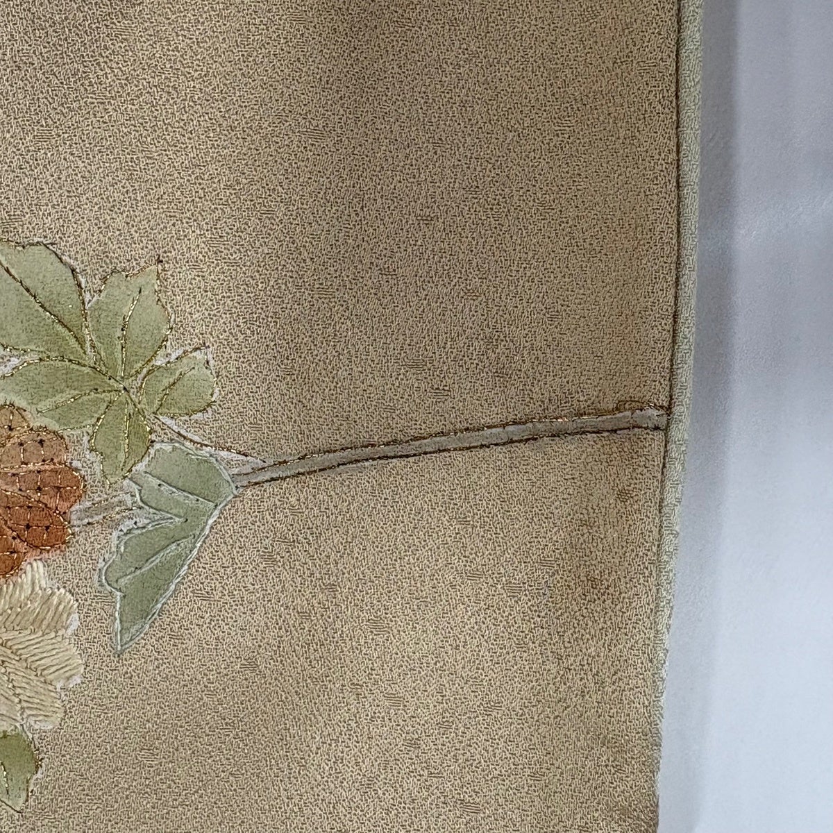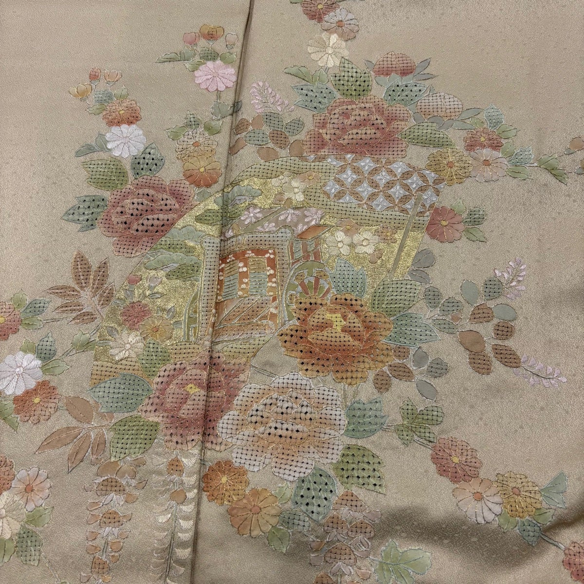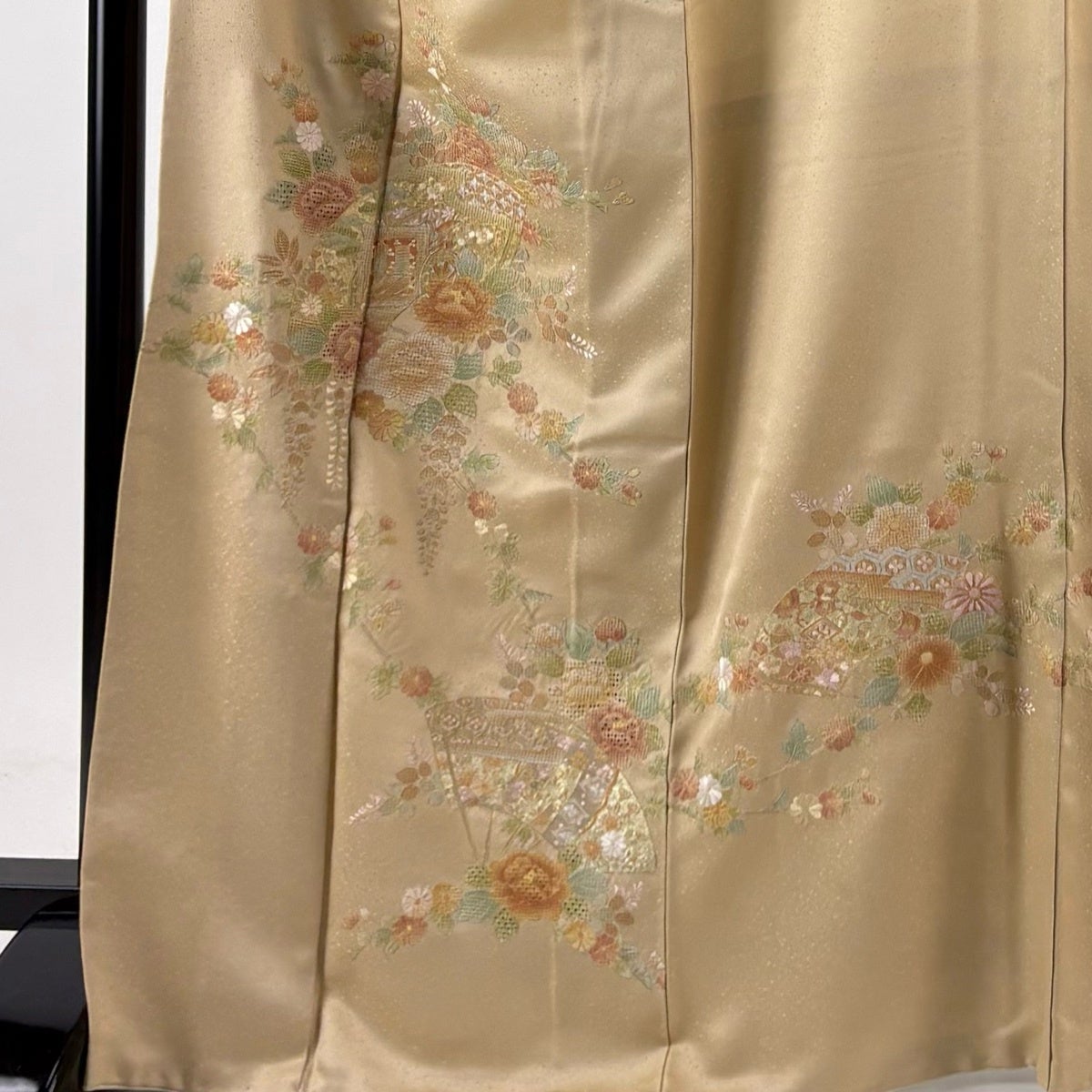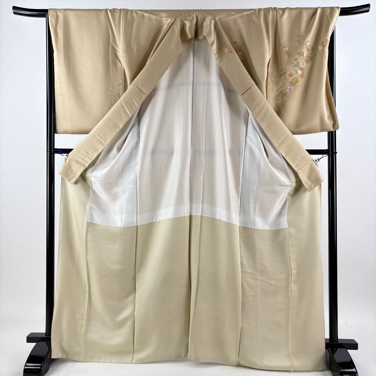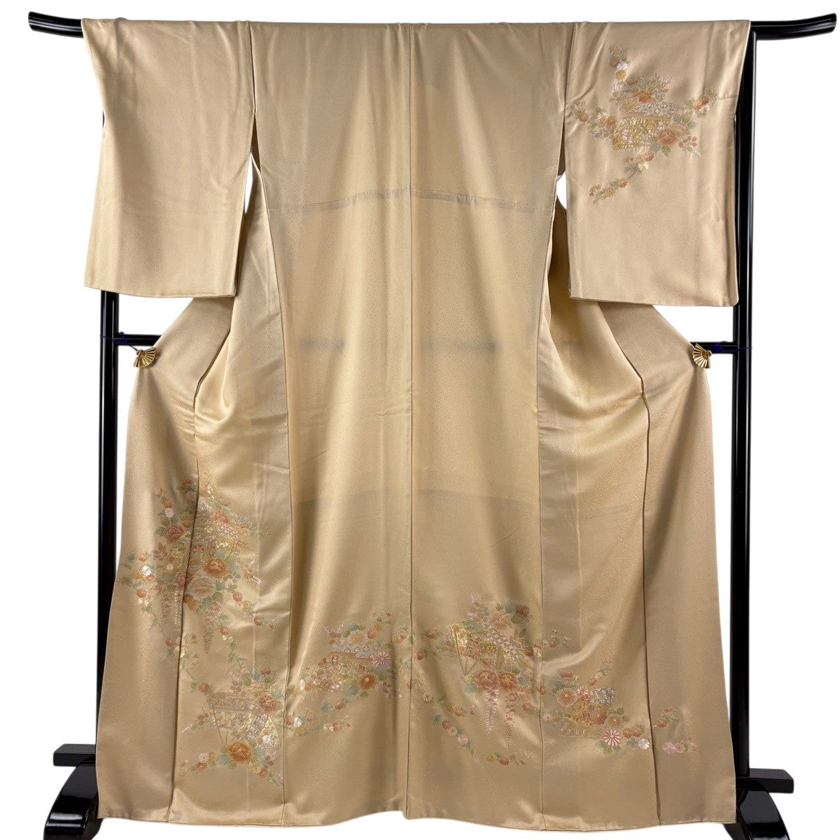 訪問着 身丈168cm 裄丈68.5cm L 袷 扇面 御所車 刺繍 金糸 ベージュ 正絹 秀品
