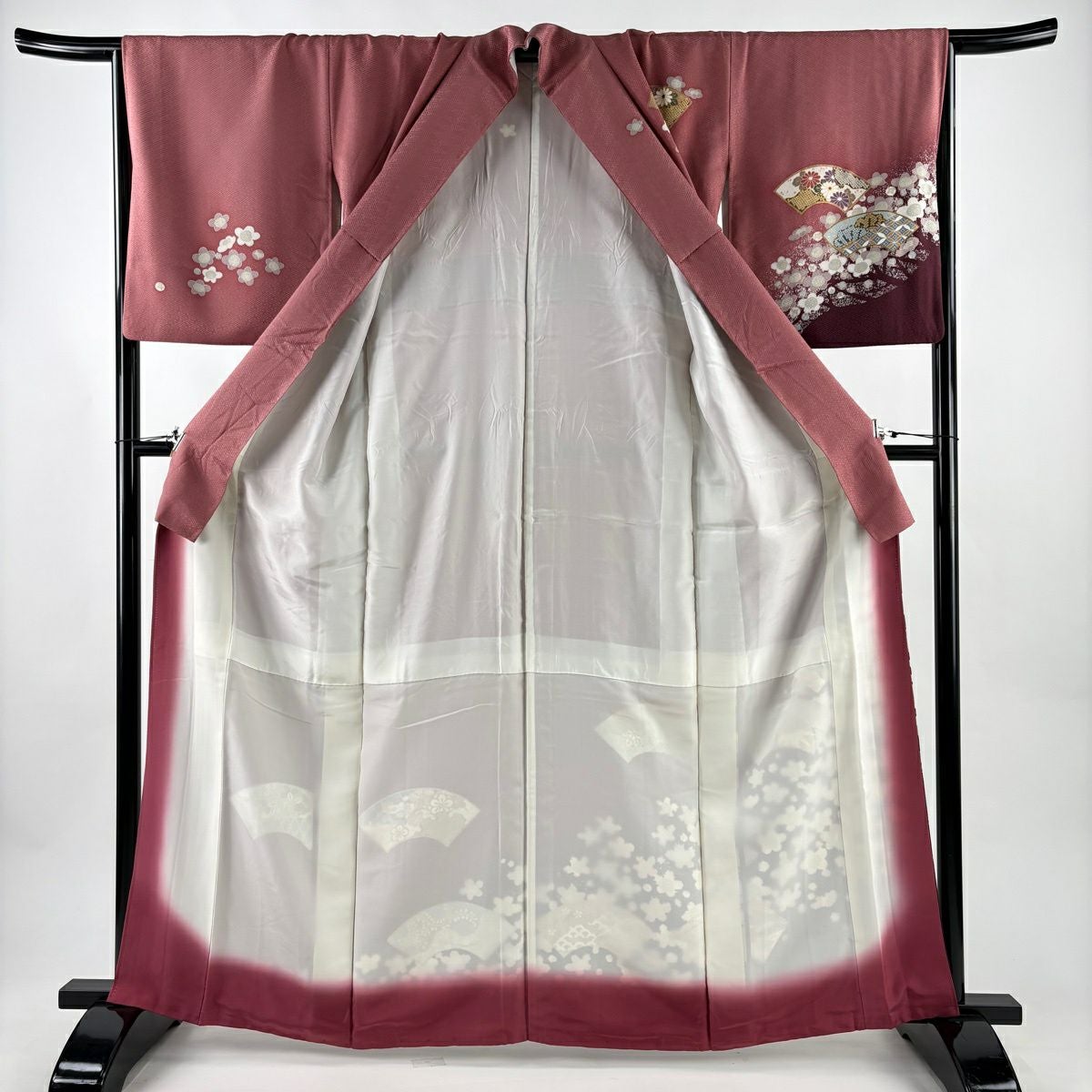 訪問着 身丈163.5cm 裄丈66cm M 袷 扇面 梅 金彩 染め分け 赤紫 正絹 秀品 一つ紋