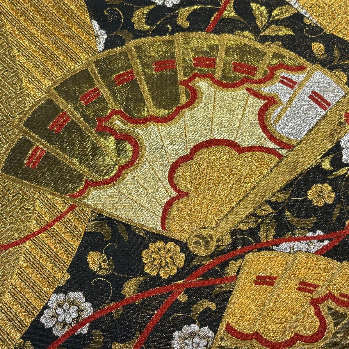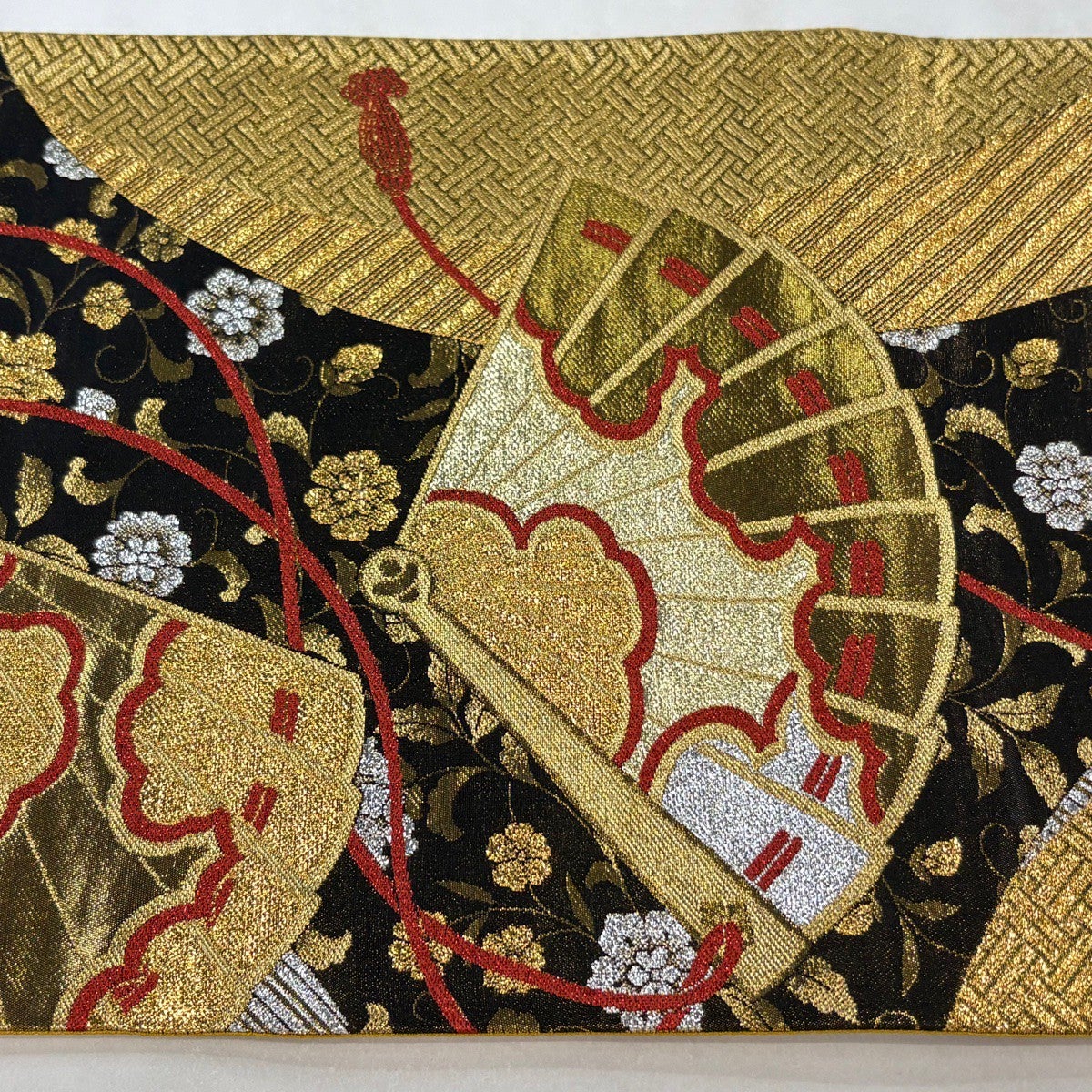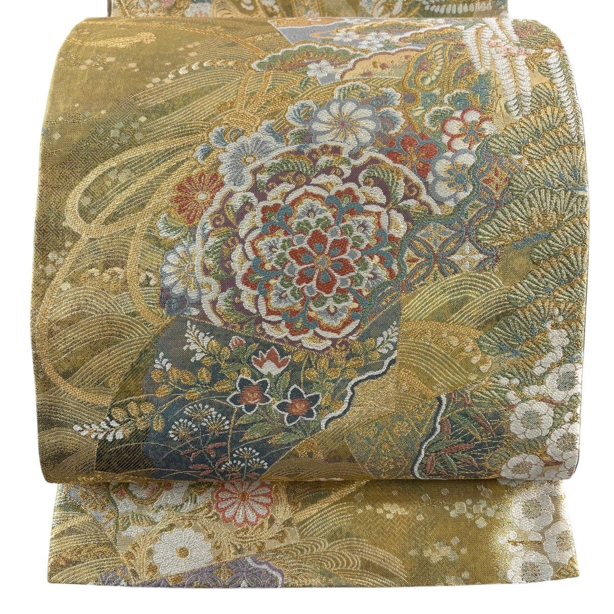 袋帯 秀品 吉祥花扇文 波 金糸 箔 金色 お太鼓柄 正絹