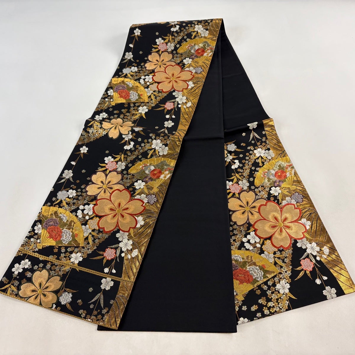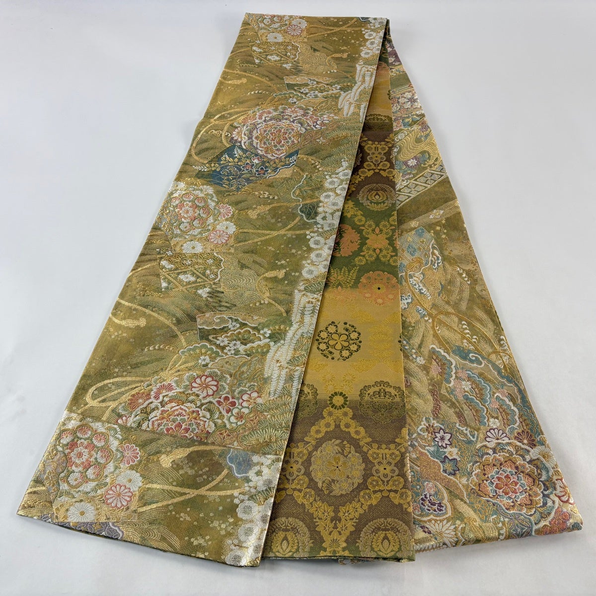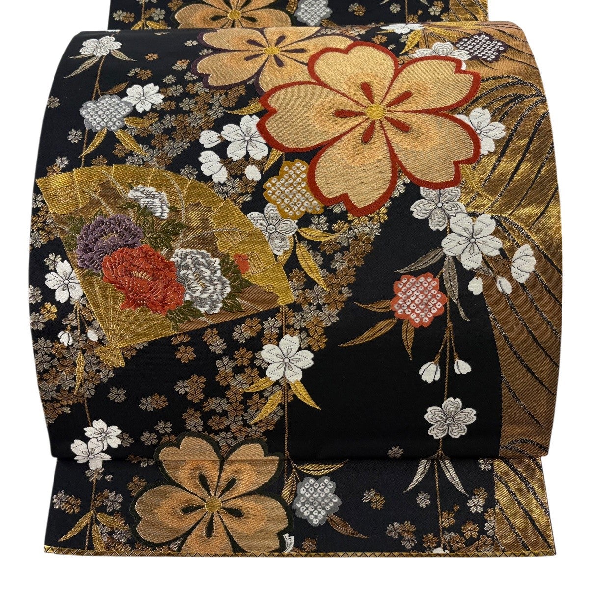 袋帯 秀品 吉祥花扇文 波 金糸 箔 金色 お太鼓柄 正絹