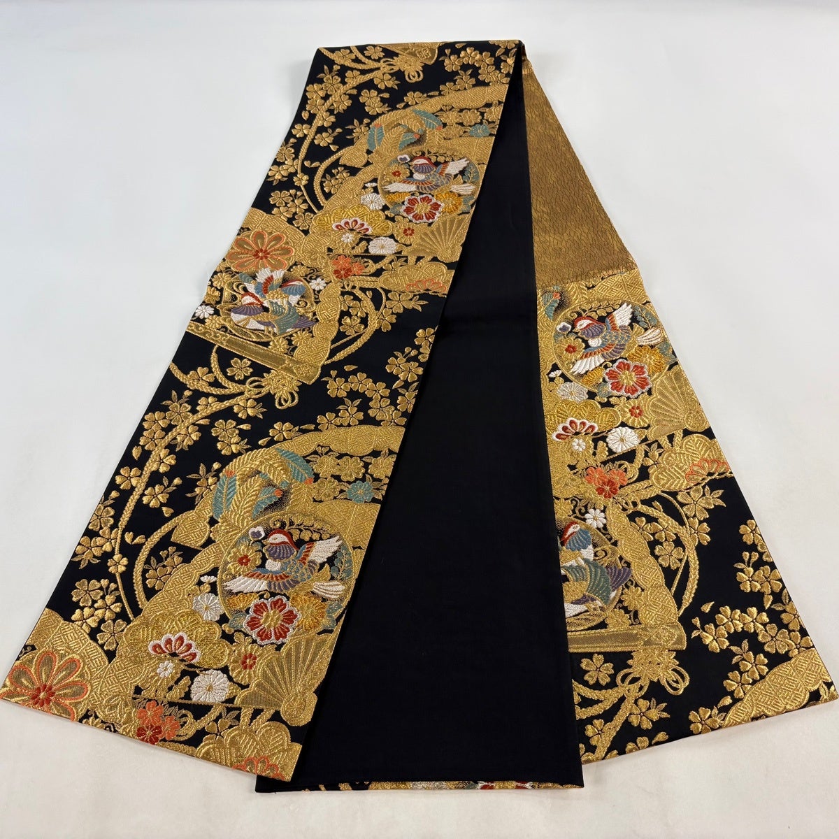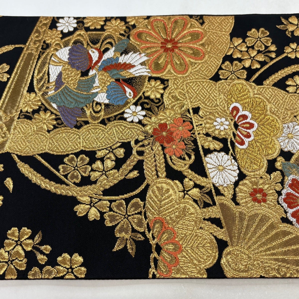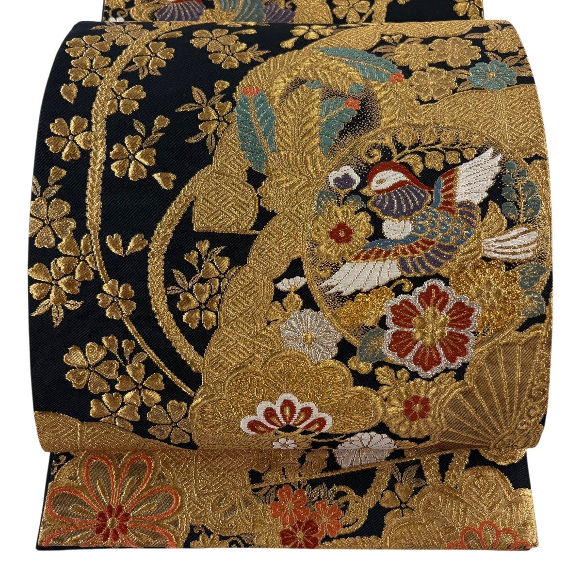 丸帯 逸品 桃山扇面鳳凰文 花鳥 御所車 金糸 箔 金色 お太鼓柄 正絹