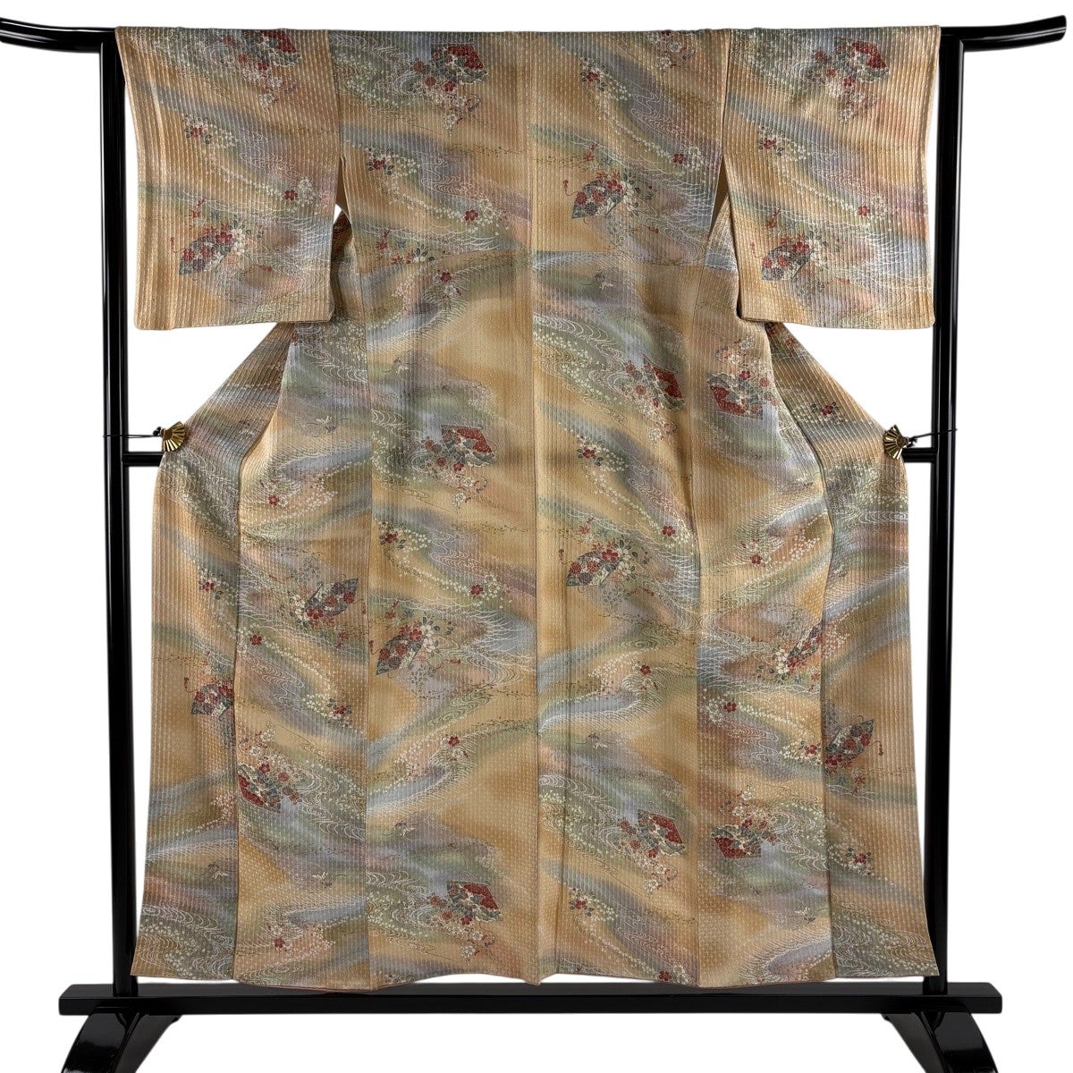【美品】 訪問着 身丈161cm 裄丈63cm S 袷 鈴乃屋 桧扇 松竹梅 刺繍 金彩 黄土色 正絹 秀品